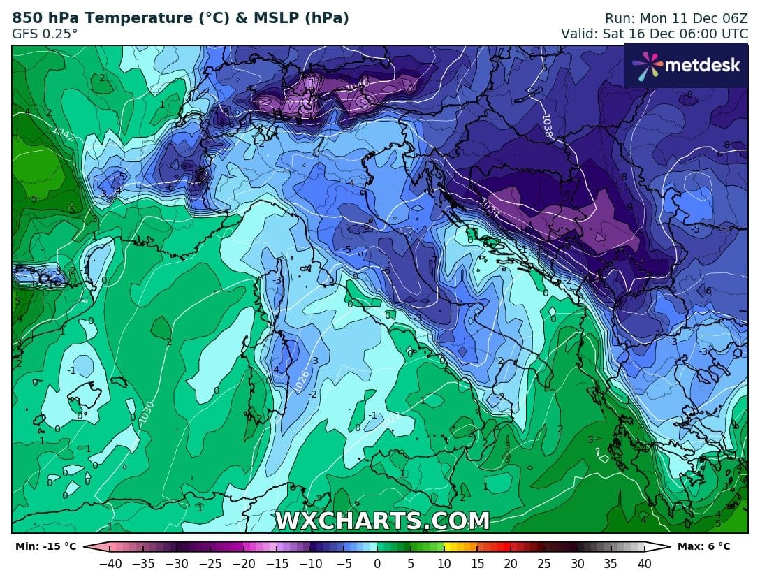 Nel week end di questa settimana precisamente sabato 16 un’irruzione artica riporterà temperature invernali su tutta la penisola anche al di sotto delle medie stagionali come si evince da questo elaborato grafico: