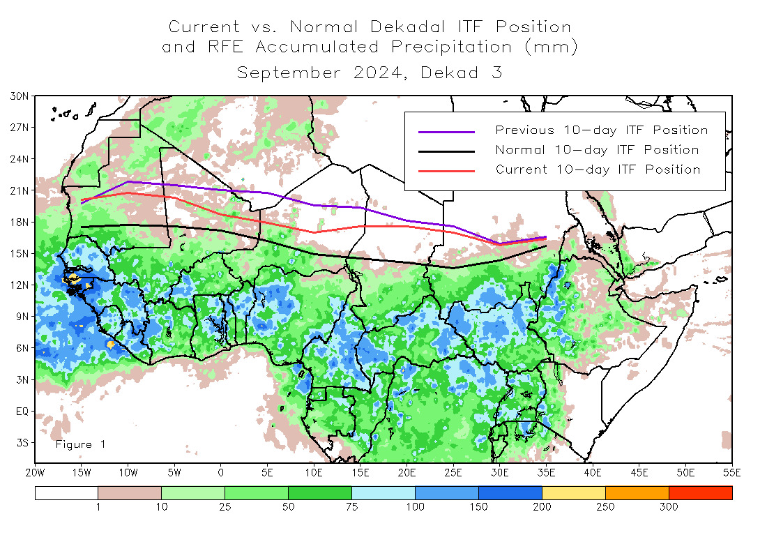 La posizione dell’ITCZ nella seconda decade di Settembre 2024, era ancora notevolmente estroflessa verso Nord e nell’elaborato è rappresentata dalla linea viola.