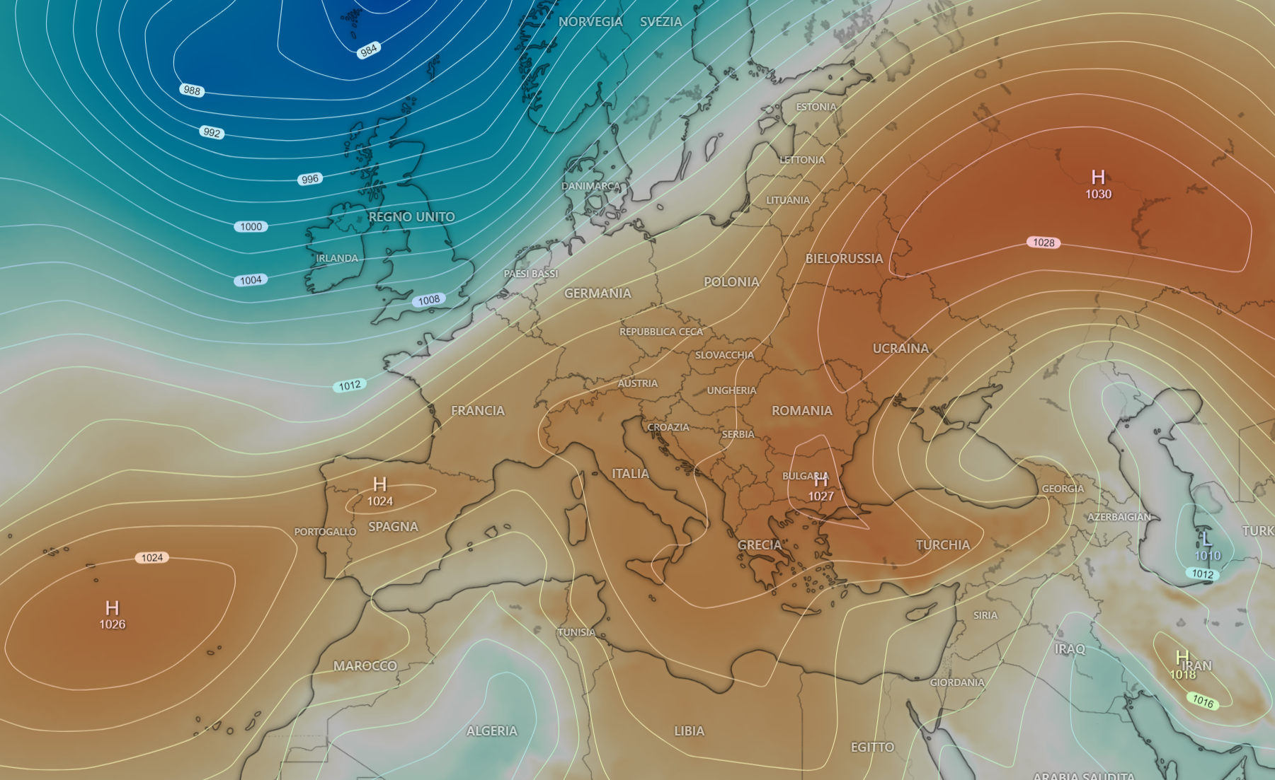 L’Anticiclone delle Azzorre sarà posizionato sulle sue Isole d’origine, con un massimo di 1026 hPa fino a raggiungere l’Europa occidentale con addirittura un secondo minimo sulla Spagna di 1024 hPa.