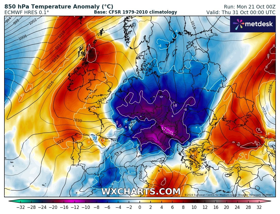 Anche il modello Europeo ECMWF si è allineato al suo collega di oltre oceano, come vediamo nell’elaborato, con una configurazione molto simile e addirittura anticipa l’evento al 31 Ottobre.