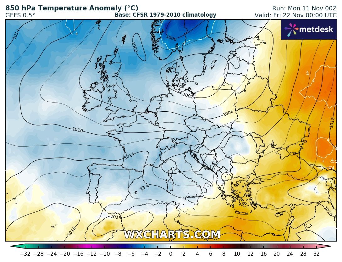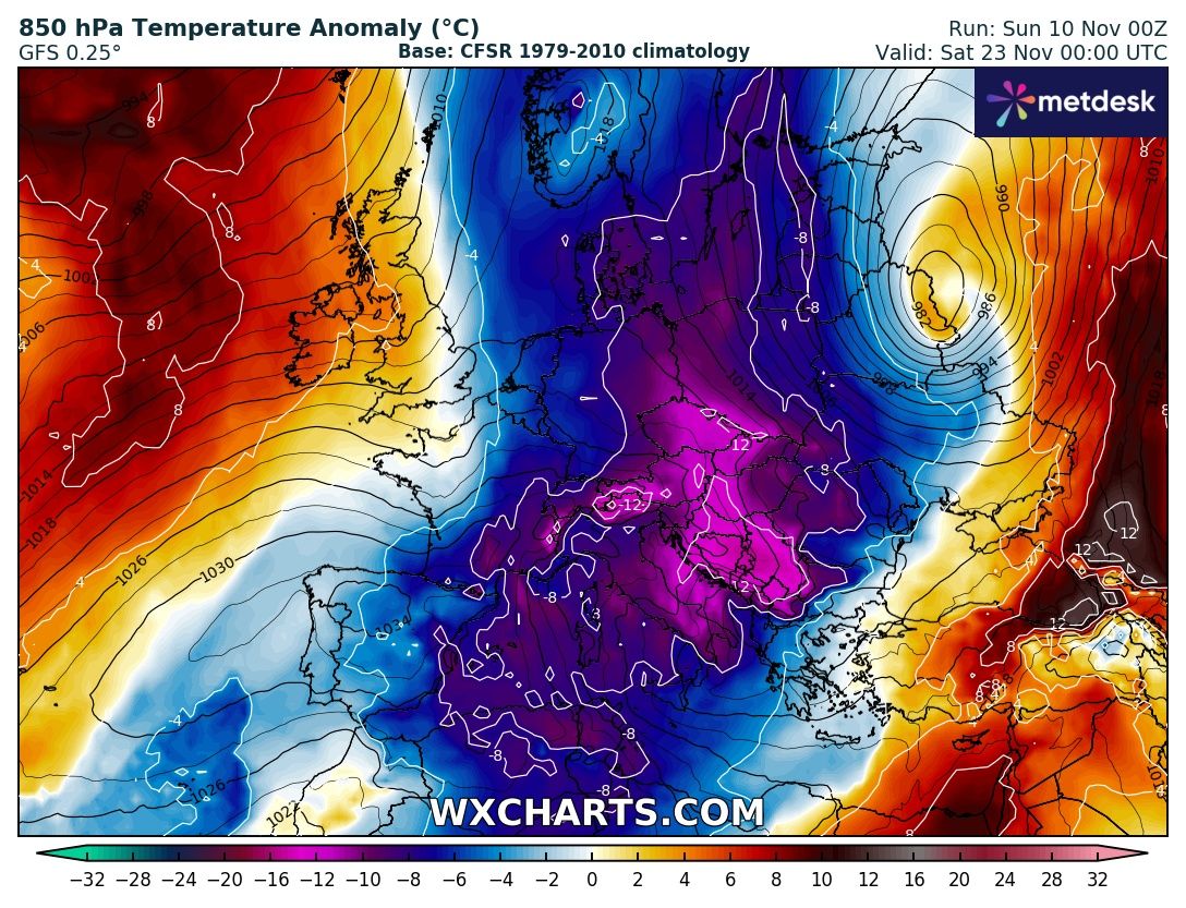 Il modello conferma un secondo blocco e rilancia con aria ancora più gelida su tutta l’Europa nella giornata di Mercoledì 20 Novembre, che dovrebbe raggiungere il culmine entro Venerdì 22 Novembre con temperature al di sotto della media del periodo 1979-2010 fino a 16 gradi.