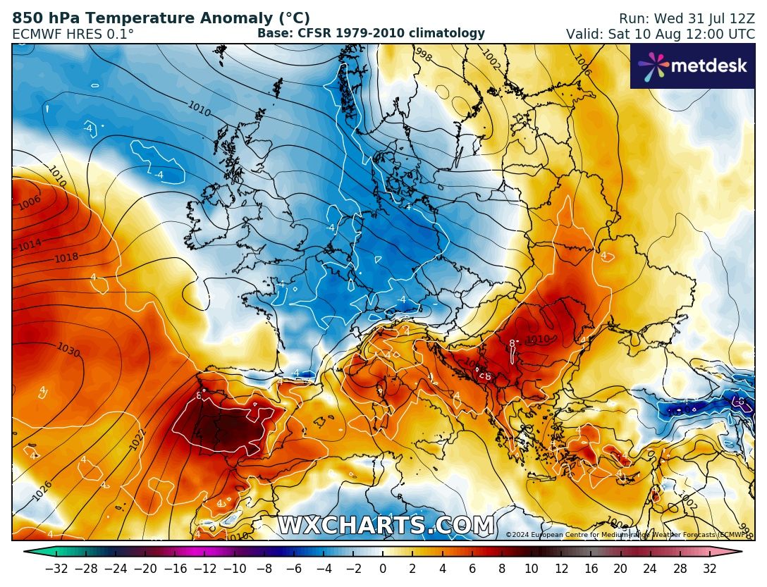 Nell’elaborato del modello Europeo ECMWF previsto per l’11 Agosto (sono 10 giorni il limite massimo per l’ high resolution) si nota il blocco di aria più fredda sull’Europa in direzione dell’Italia (clicca per ingrandire):