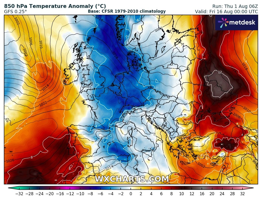 Come potete vedere nell’elaborato del modello Americano GFS previsto per il 15 Agosto insiste su una corposa discesa di aria fredda sull’Italia fino a 6° al di sotto della media del periodo (clicca per ingrandire):