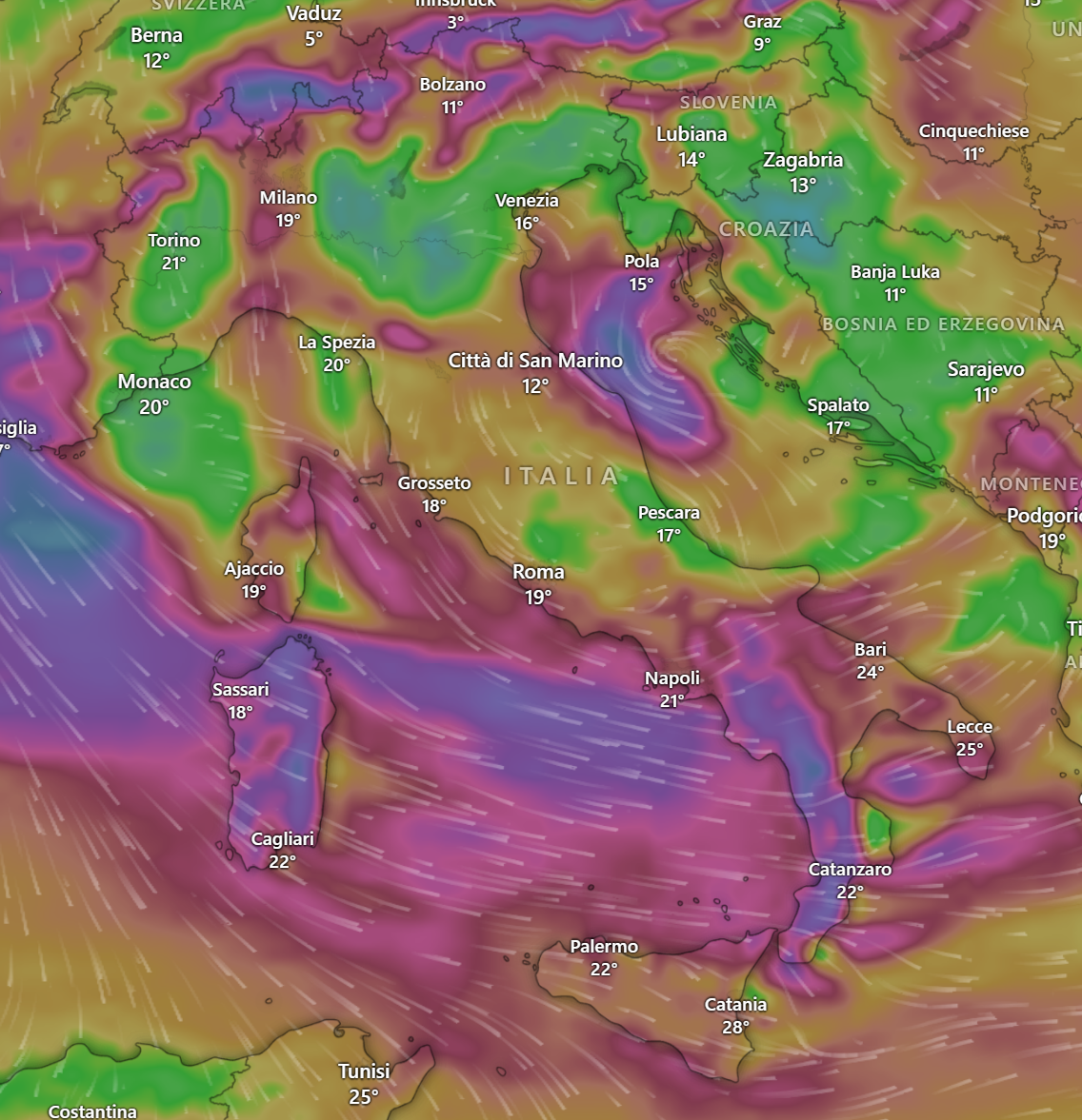 Il Maestrale da Nord Ovest soffierà sulla Sardegna, Sicilia, Campania e Calabria con raffiche oltre i 100 km/h, mentre sulla Puglia vi sarà il Libeccio da Sud Ovest con raffiche fino a 70 km/h.