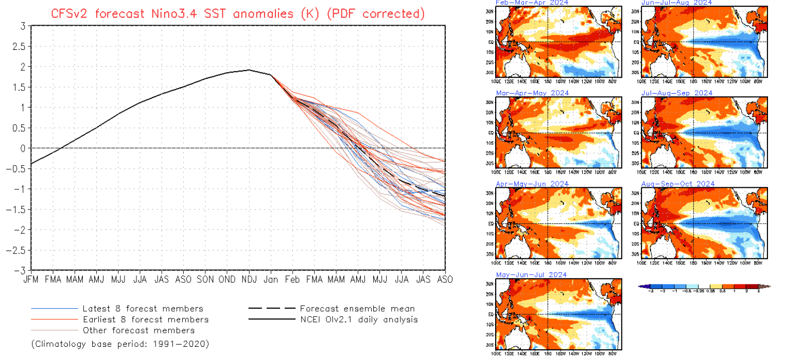 La media dell’insieme CFS.v2 (linea tratteggiata nera) indica che El Niño potrebbe effettuare la transizione a ENSO neutrale nel marzo-maggio 2024, seguito da una transizione a La Niña intorno Maggio-luglio 2024: