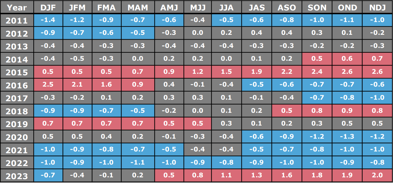 In questa tabella troviamo gli andamenti del Nino e della Nina negli ultimi 11 anni (in rosso l’anomalia dei gradi del Nino in blu la Nina):