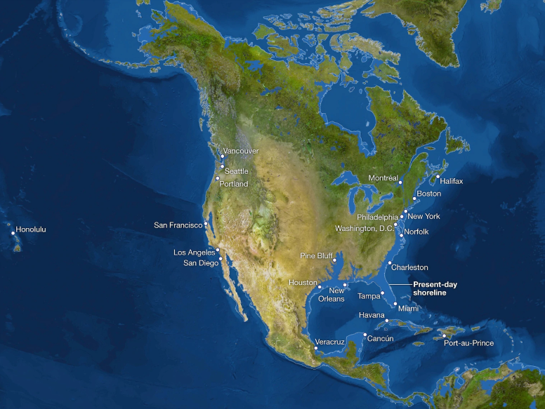 Lungo l’intera costa atlantica, la scomparsa dei ghiacci causerebbe un innalzamento del livello del mare, portando alla sommersione di vaste aree, inclusa la Florida e la costa del Golfo del Messico.