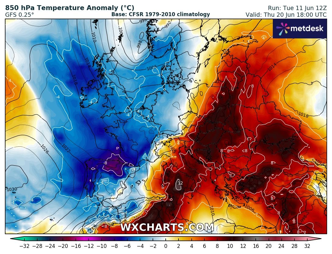 Considerando che Venerdì 21 Giugno l’Anticiclone Africano sarà ancora su tutta l’Italia, con temperature fino a 12° sopra le medie, e l’aria fredda in arrivo Sabato 22 Giugno sarà di almeno 8° sotto le medie, si avvertirà una brusca diminuzione delle temperature su tutta la Penisola.
