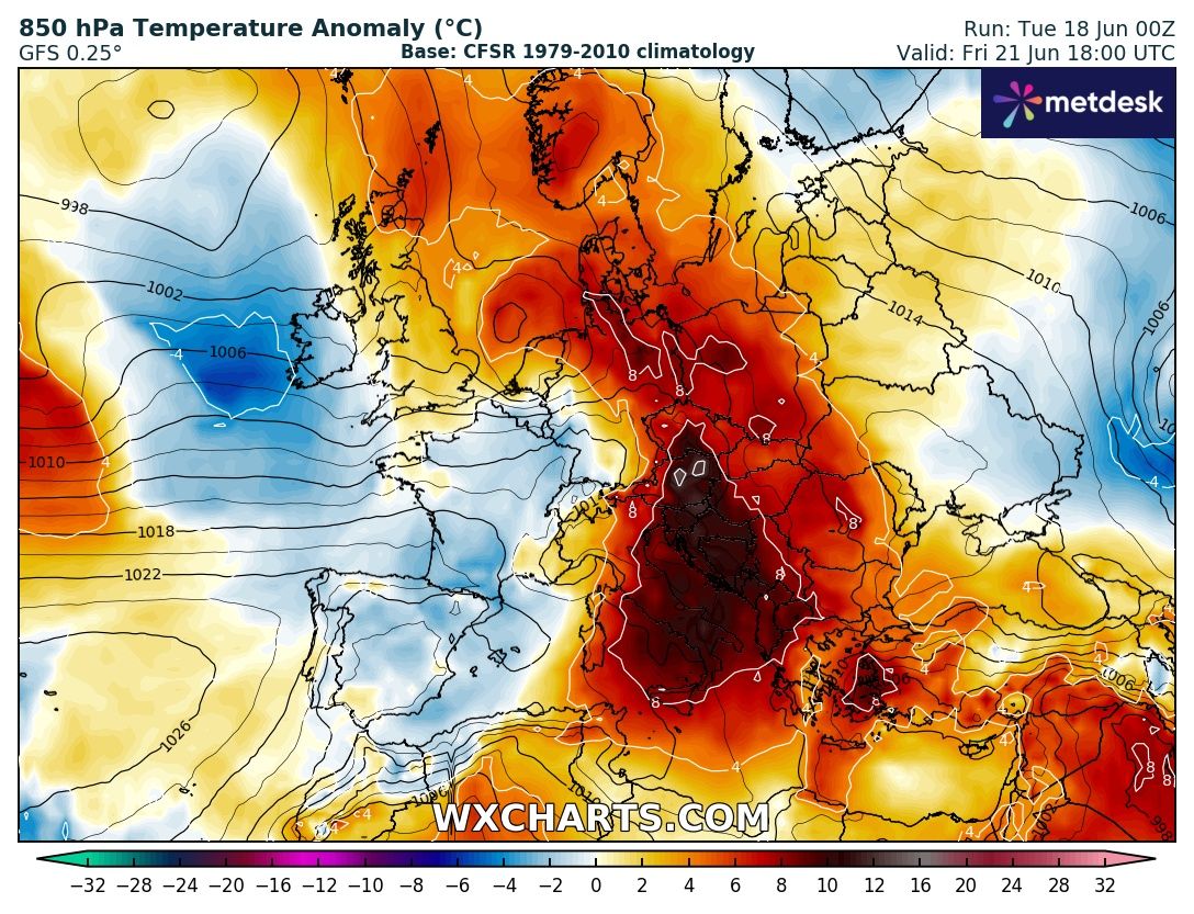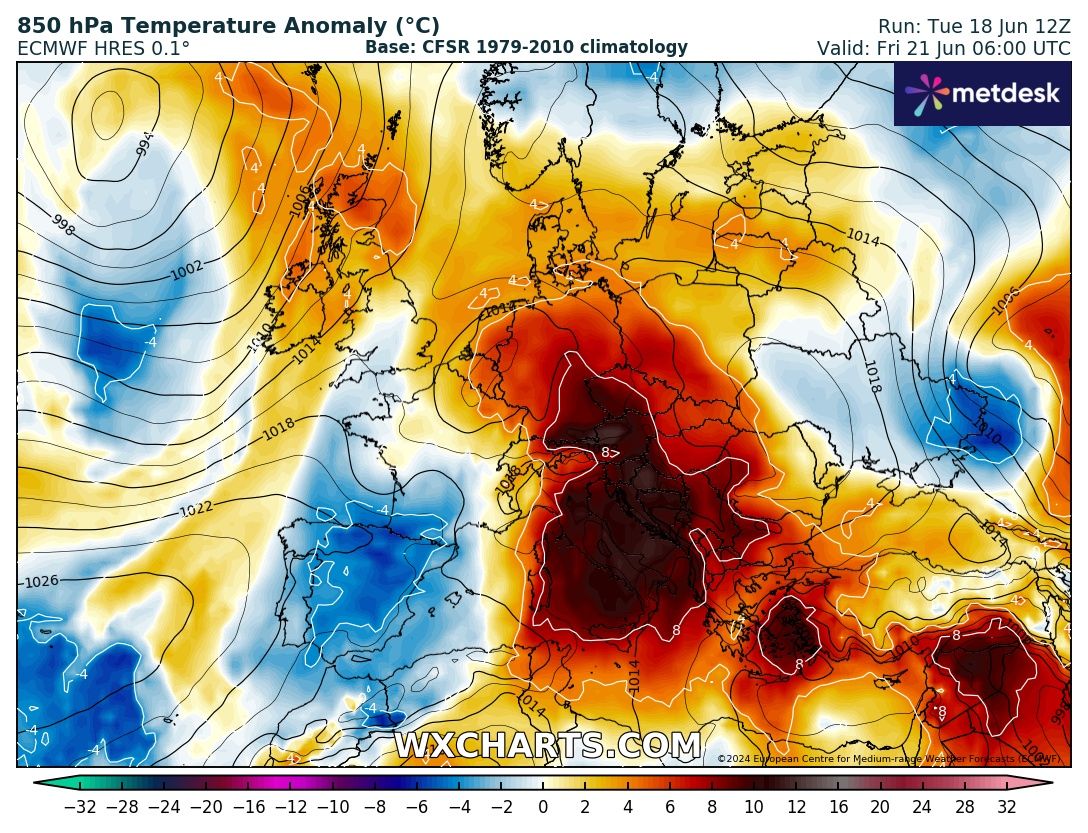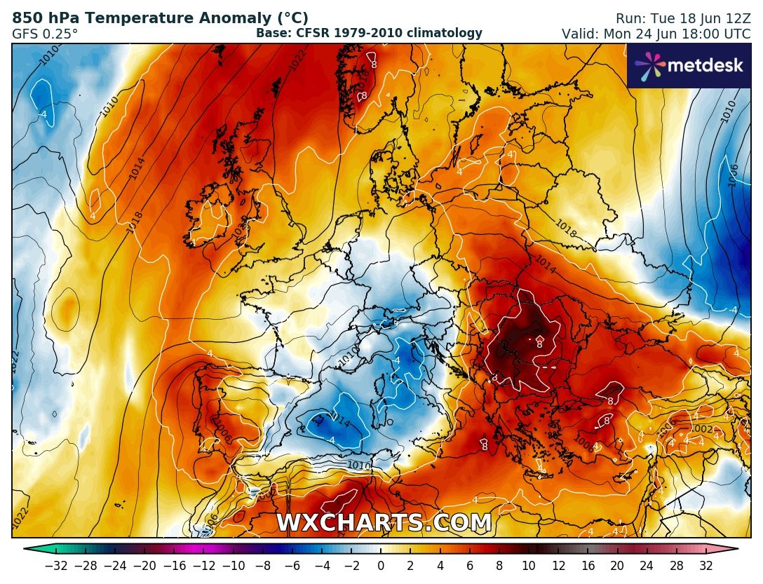 Considerando che si passerà dal caldo anomalo di Venerdì 21 con temperature fino a 12° oltre le medie, a Lunedì 24 Giugno con temperature sotto le medie di almeno 4°, sarà una diminuzione molto accentuata.
