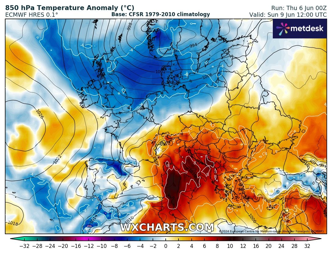 L’ultimo run del modello Europeo ECMWF, conferma la massima espansione dell’Anticiclone Africano per la giornata di Domenica 9 Giugno, ma anche i primi segnali di cedimento dello stesso, con temporali sulle regioni settentrionali, mentre al Centro Sud e sulle Isole maggiori avremo il picco di caldo, con temperature oltre i 10° rispetto alle medie stagionali.