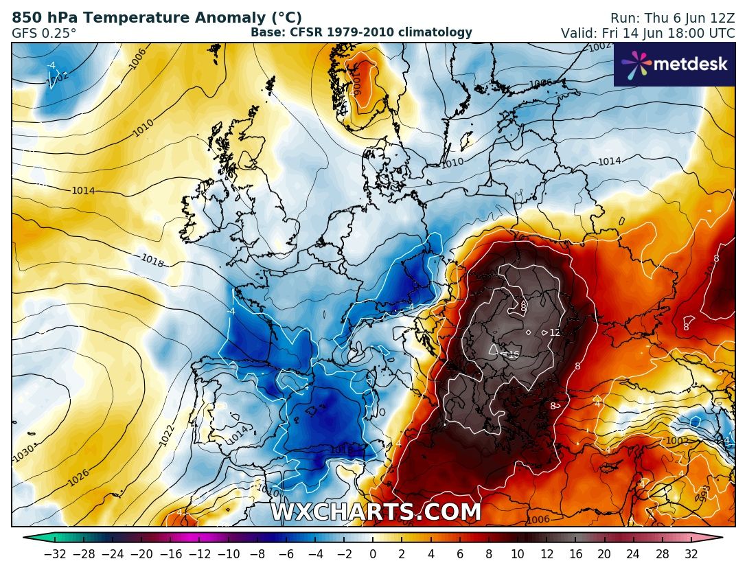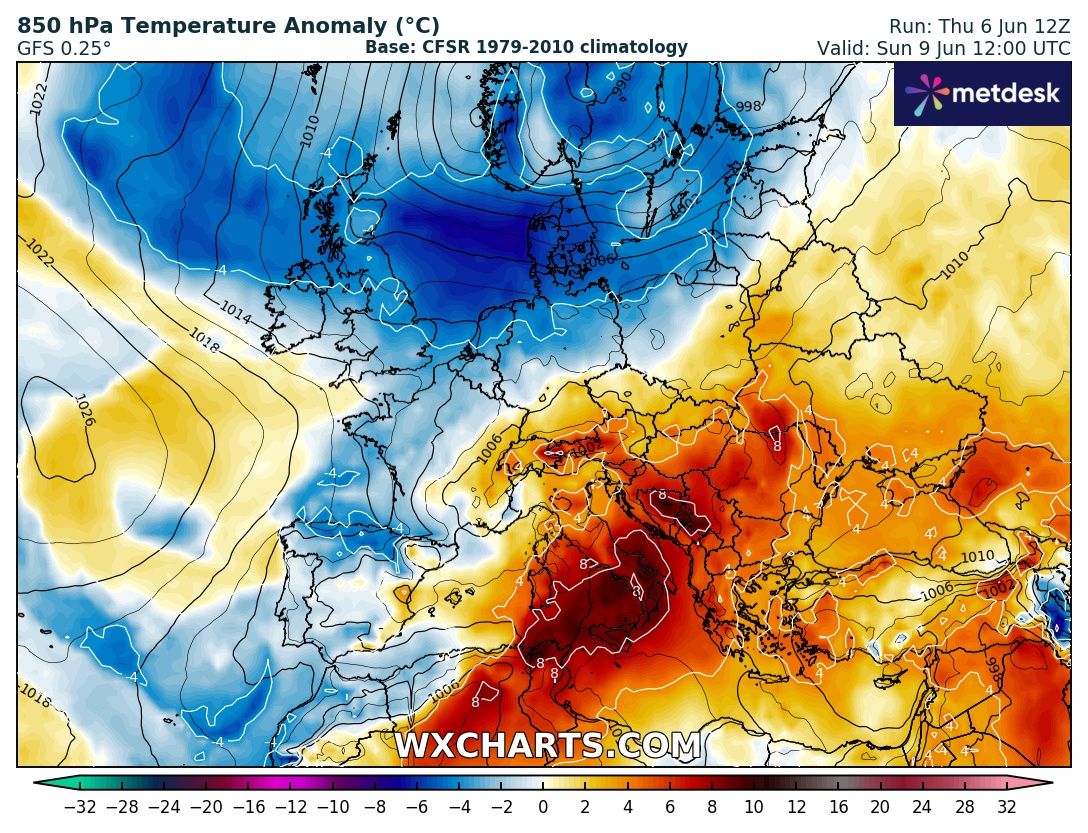 Anche oggi il modello Americano GFS vede temperature sopra i 10° rispetto alle medie del periodo 1979 – 2010, nella giornata di Domenica 9 Giugno, oltre all’indebolimento dell’Anticiclone Africano al Nord: