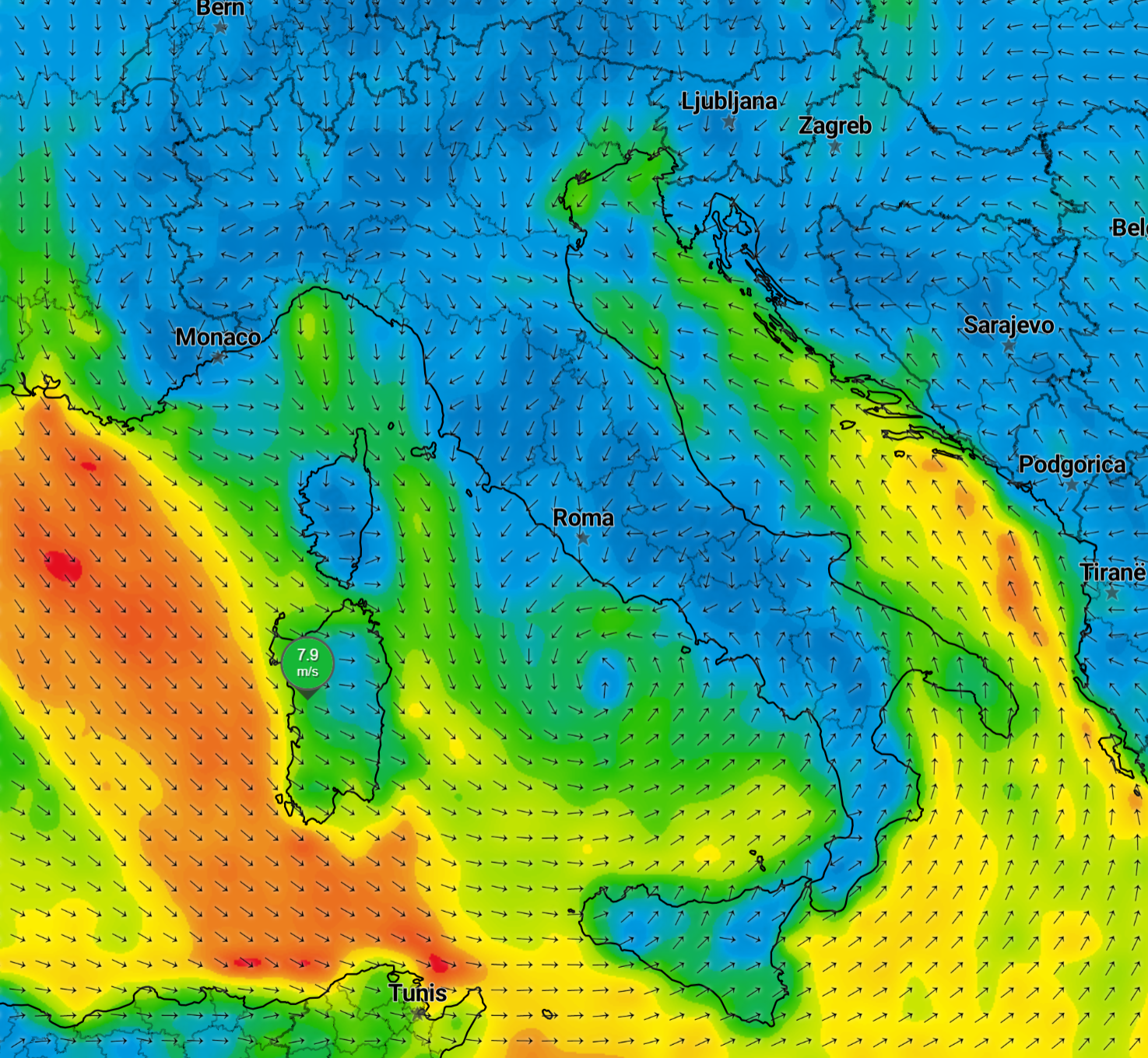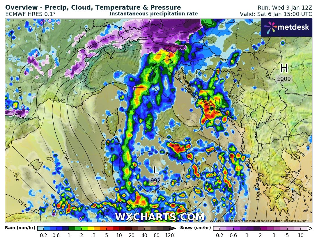 Entro il pomeriggio la perturbazione si troverà sul medio Tirreno con un minimo di 990 hPa: