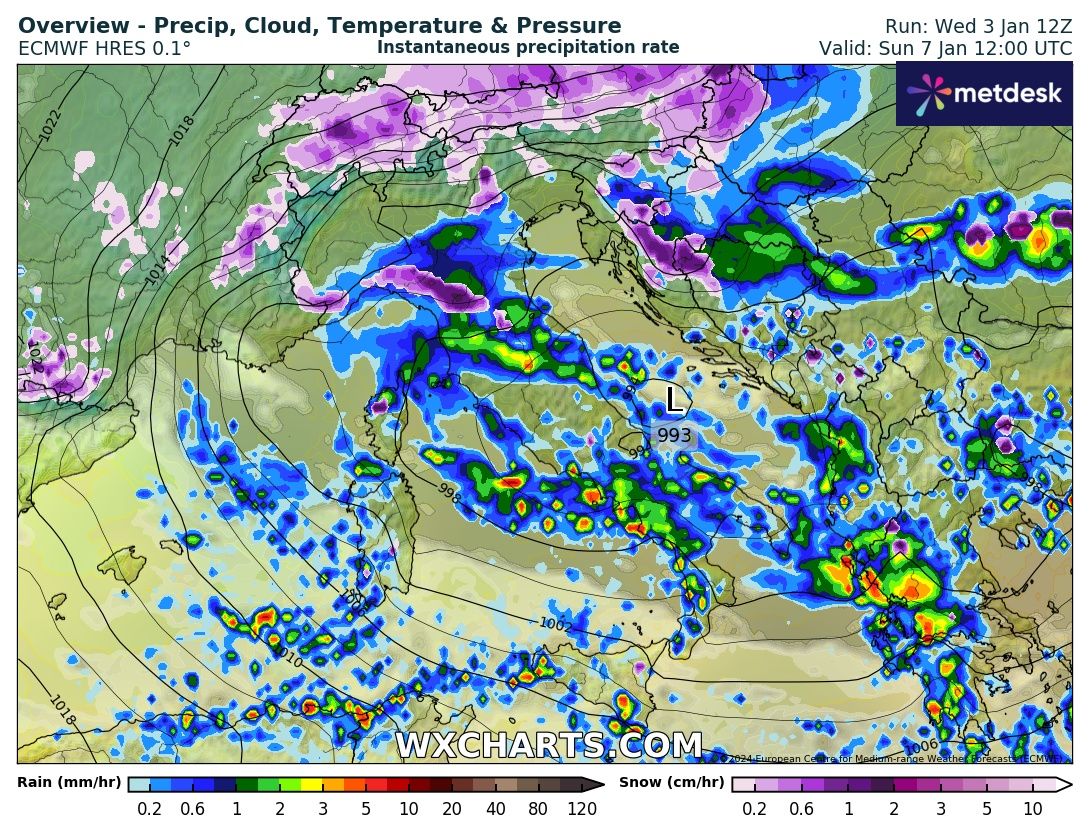 Il giorno dell’Epifania troveremo piogge sui settori nord orientali dell’Italia, oltre al centro sud sul lato tirrenico ed isole maggiori e nevicate sul settore Alpino centro orientale sempre a quote molto basse ed a esclusione del Friuli Venezia Giulia per un richiamo di venti da sud sulla regione.