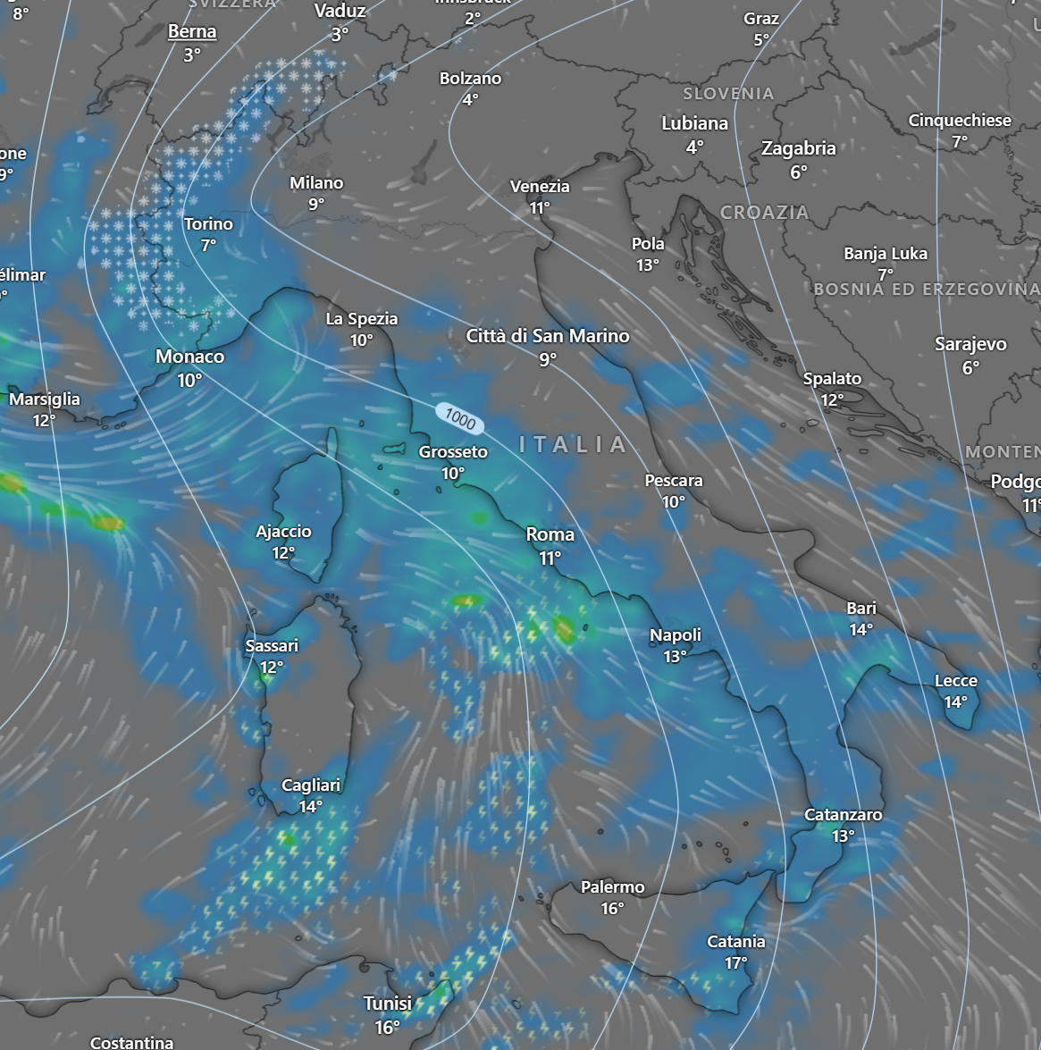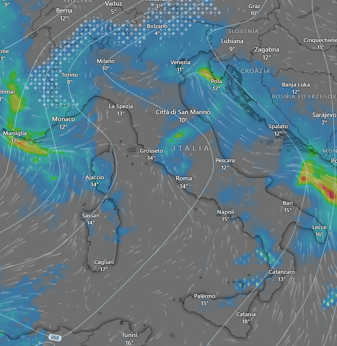 Nel primo pomeriggio le piogge persisteranno su quasi tutti i settori e saranno copiose sul Centro della nostra Penisola, oltre a nevicate sulle Alpi Centro occidentali a quote medio basse e vi saranno dei temporali sulla Sicilia e la Calabria.