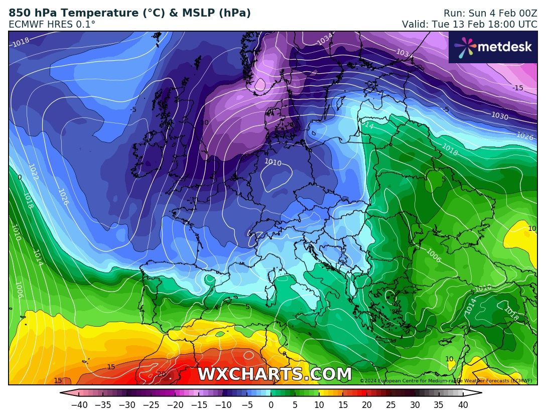 In questo elaborato del Modello Europeo ECMWF delle temperature a 850 hPa (circa 1550 metri d’altezza) previsto per Lunedì 12 Febbraio, notiamo appunto che l’apporto di aria fredda arrivare sull’Italia (clicca per ingrandire):