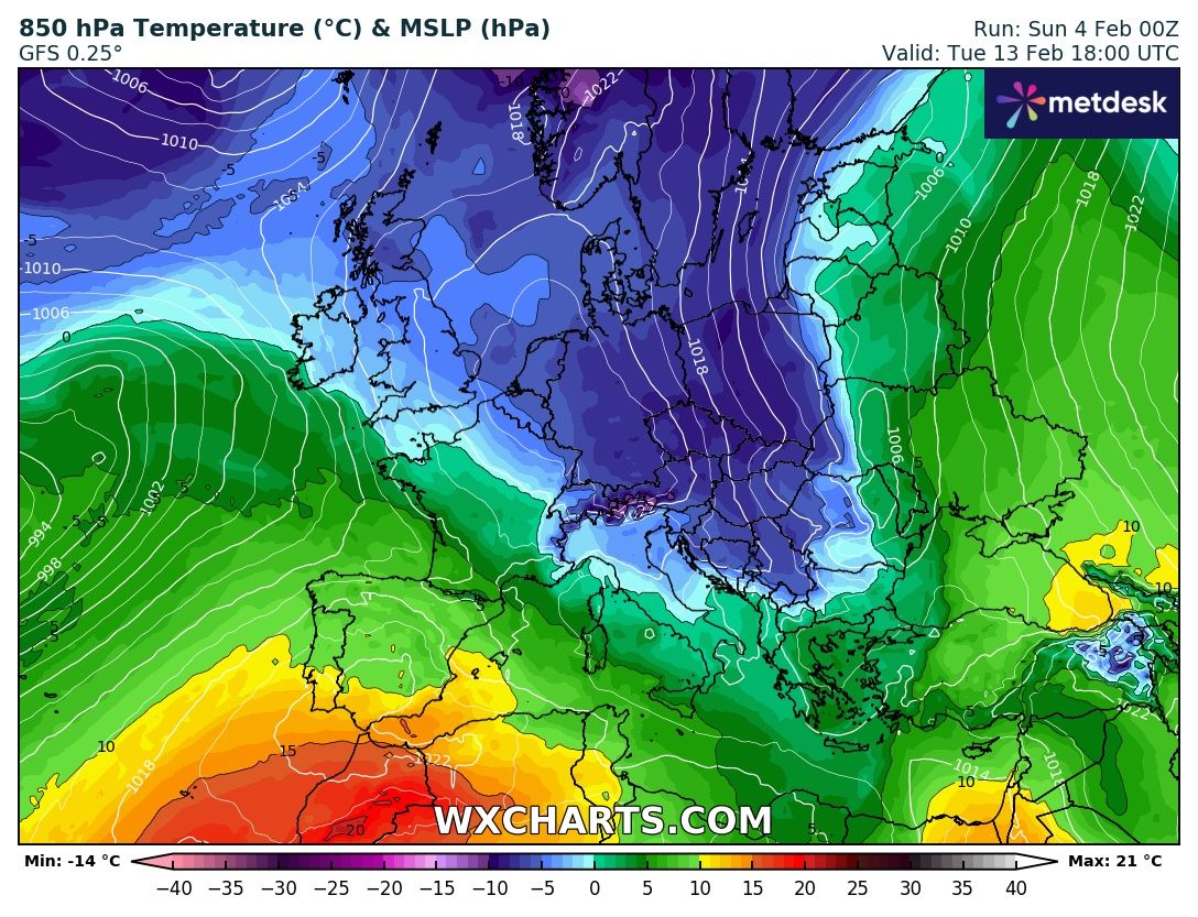 Come anticipato, l’anticiclone delle Azzorre, sarà diretto verso Nord e quello Africano si allungherà fino sull’Est Europeo per poi dirigersi anche lui verso nord, provocando una discesa di aria fredda proprio sull’Italia.