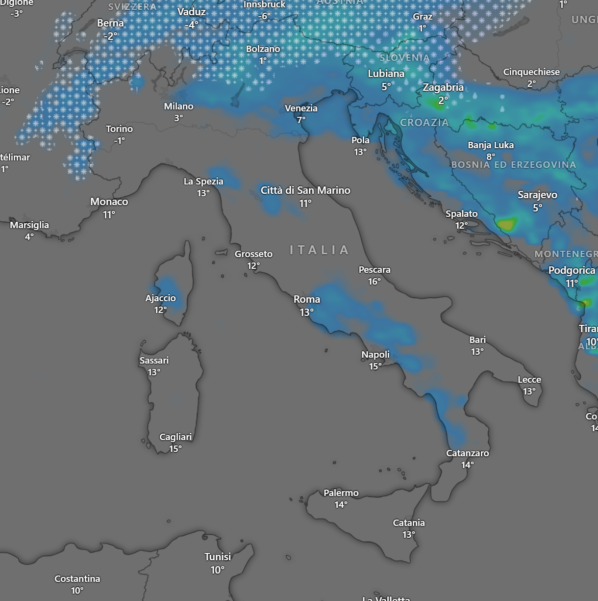 Nel tardo pomeriggio le piogge saranno presenti sulle Marche, l’Abruzzo ed il Lazio, mentre vi saranno nevicate sulle Alpi Centro occidentali ed Appennino Tosco Emiliano.
