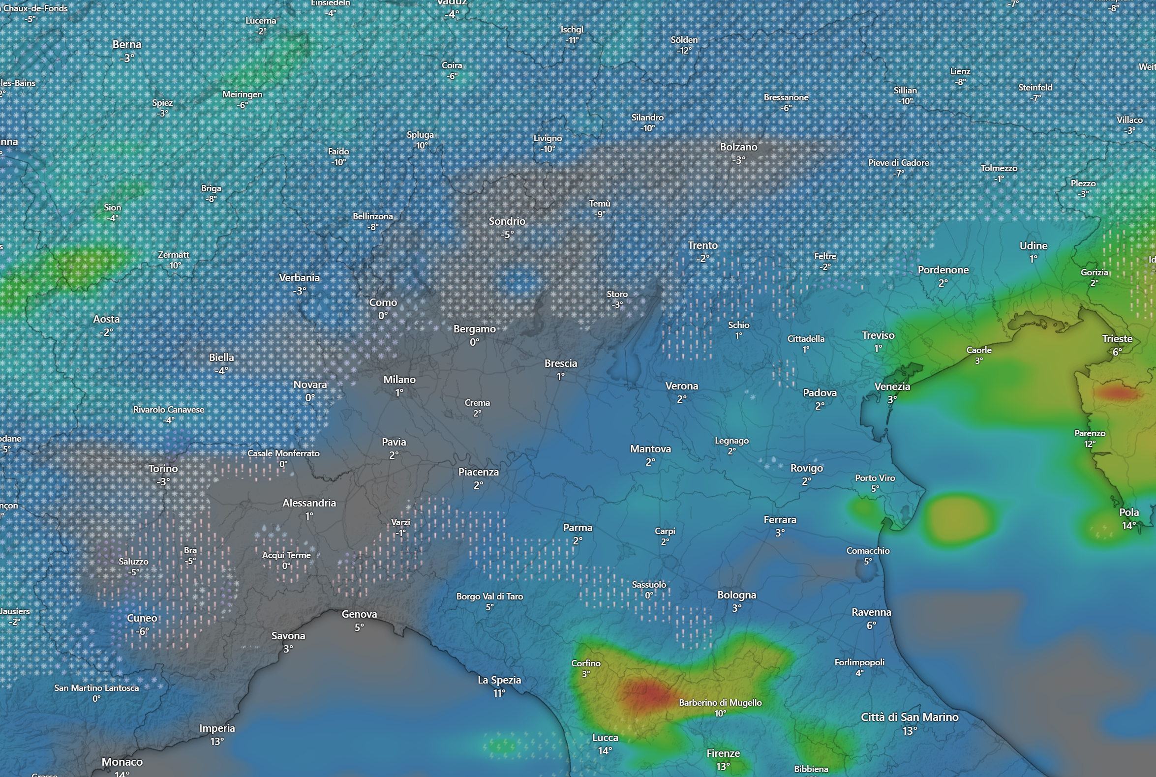 Questa configurazione oltre ad apportare intense piogge su quasi tutta l’Italia, attiverà anche delle autentiche bufere di neve sulle Alpi alle quote medie, in rapida diminuzione fino a raggiungere quasi tutte le pianure del Nord, ma vediamo nel dettaglio la previsione.