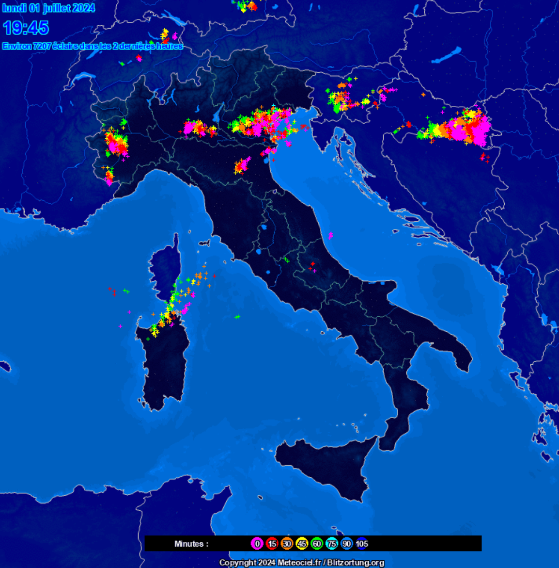 Alle ore 20 sono presenti temporali anche di forte intensità, su molte zone del Nord Italia come vediamo nell’elaborato del radar fulmini (clicca per ingrandire):