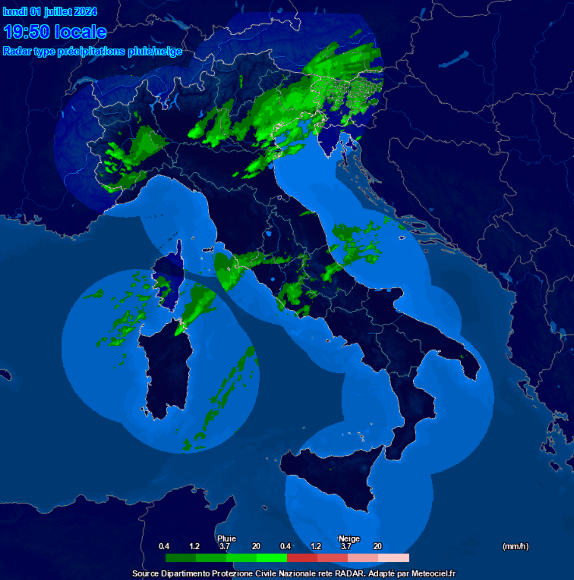 Questo invece è l’elaborato del radar piogge sempre delle ore 20 (clicca per ingrandire):