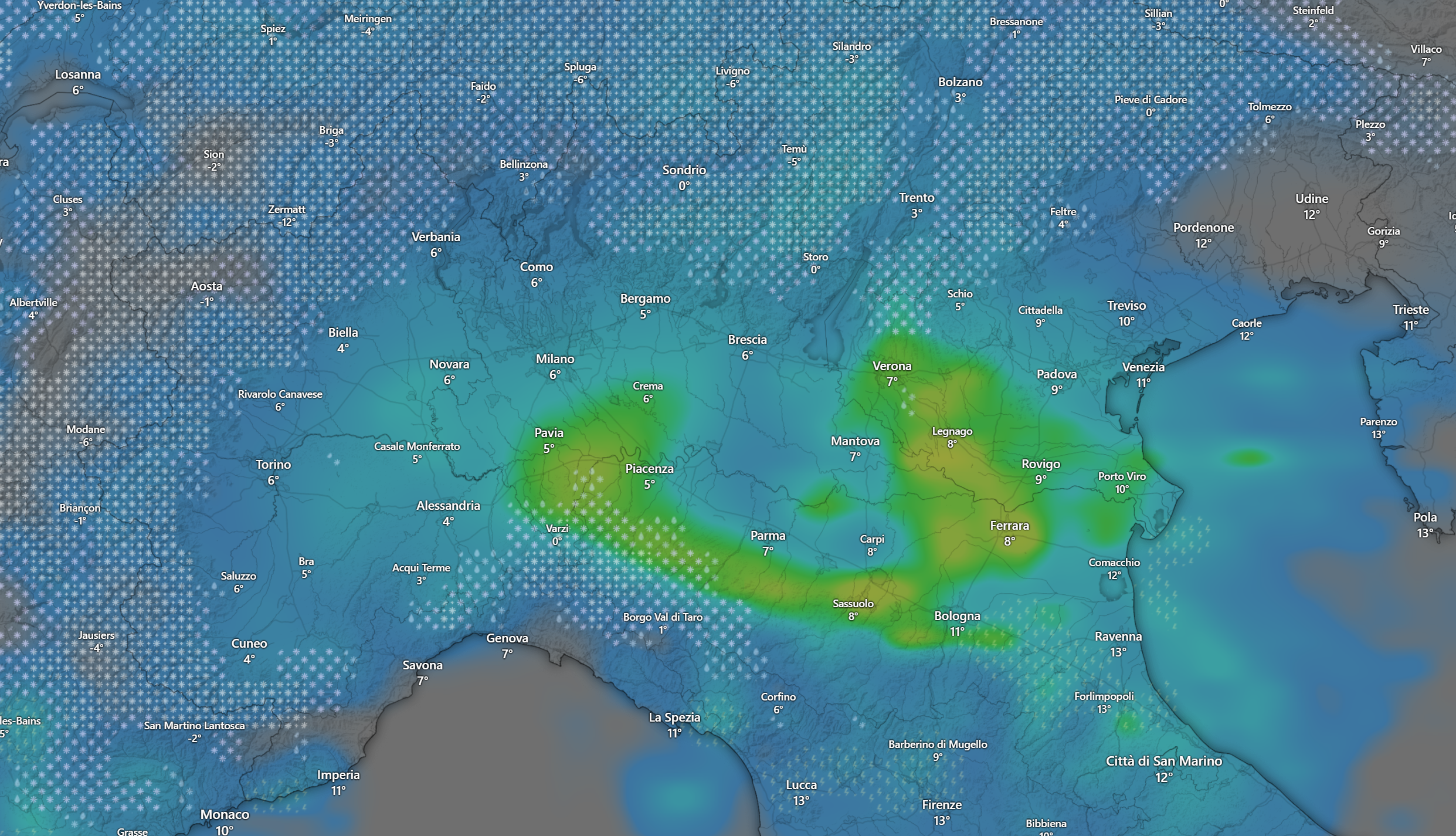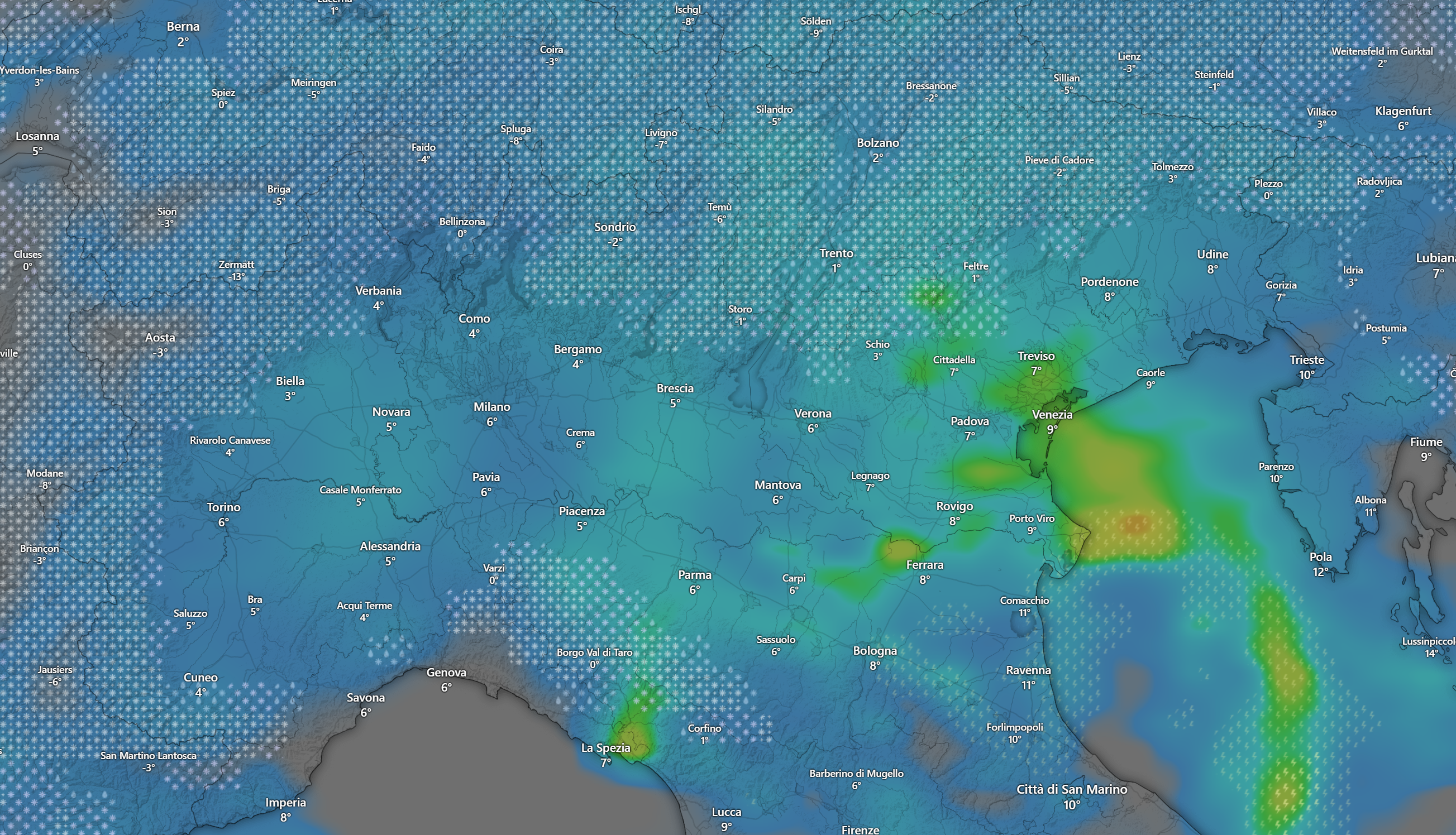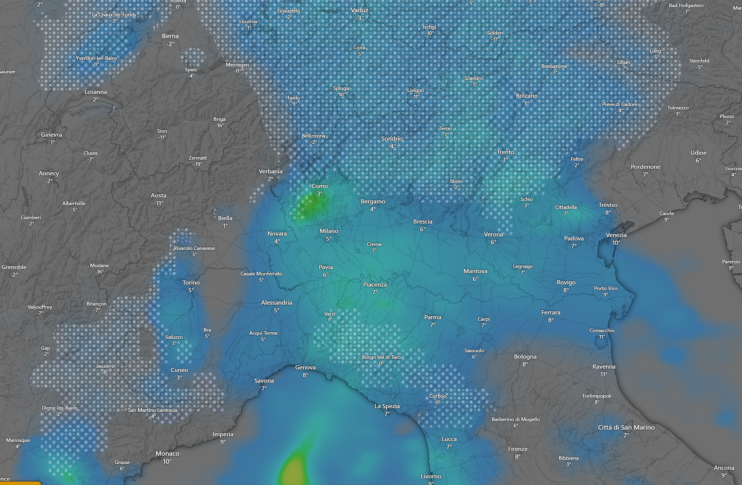 Alle ore 20 la situazione al Nord sarà pressoché invariata, con piogge diffuse e nevicate sulle Alpi ed i rilievi della Liguria a quote molto basse fino in pianura nelle zone limitrofe ai monti.