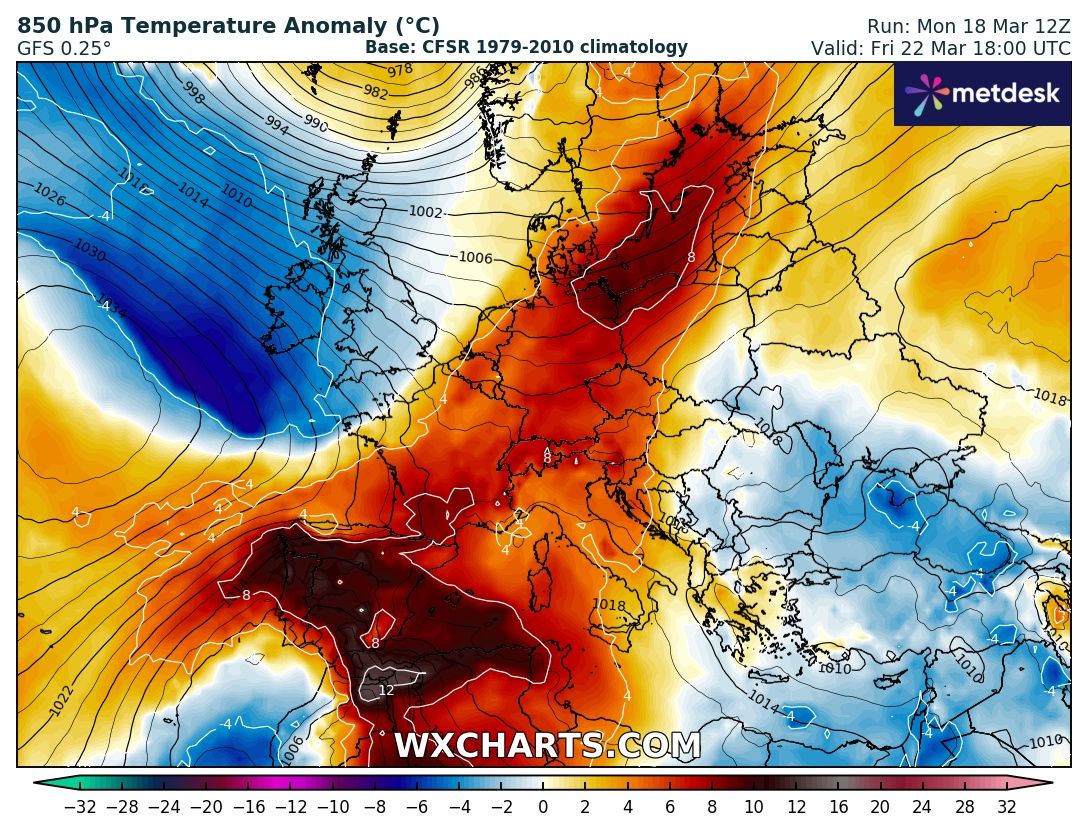 Come si nota nell’elaborato grafico previsto per sabato 23 Marzo, una risalita di aria calda direttamente dal Nord Africa sull’Italia, porterà temperature oltre le medie stagionali fino a +8° sull’Italia e + 12° sulle Isole maggiori: