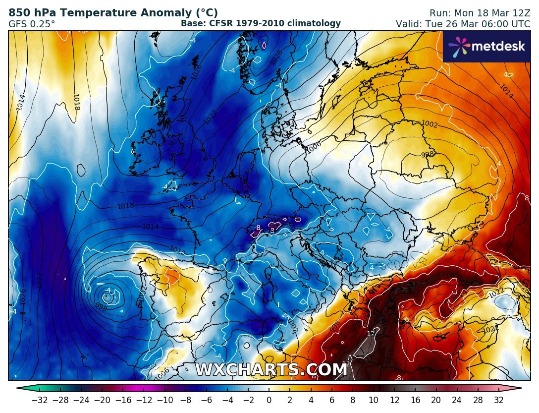 Poi una discesa di aria fredda prevista per Martedì 26 Marzo, farà rientrare le temperature anche al di sotto della media stagionale fino a -8°: