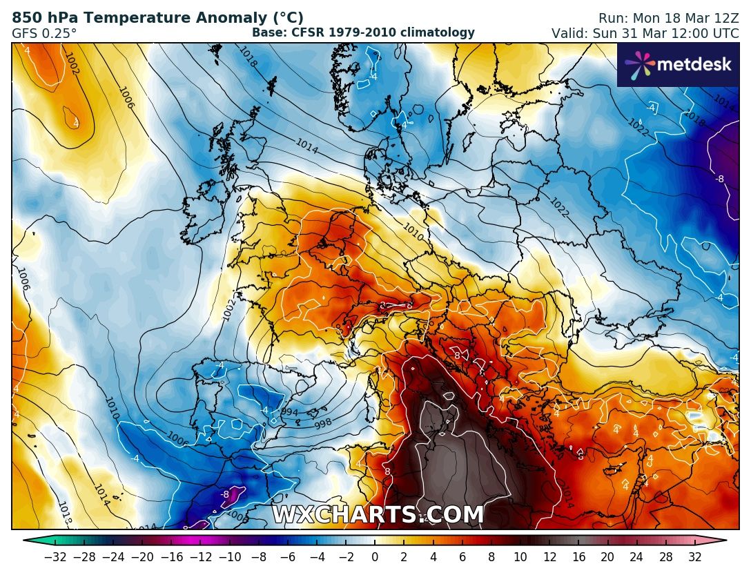 Infine una ripresa delle correnti da Sud farà lievitare i termometri il giorno di Pasqua il 31 Marzo con temperature anche di + 16° rispetto alla media stagionale: