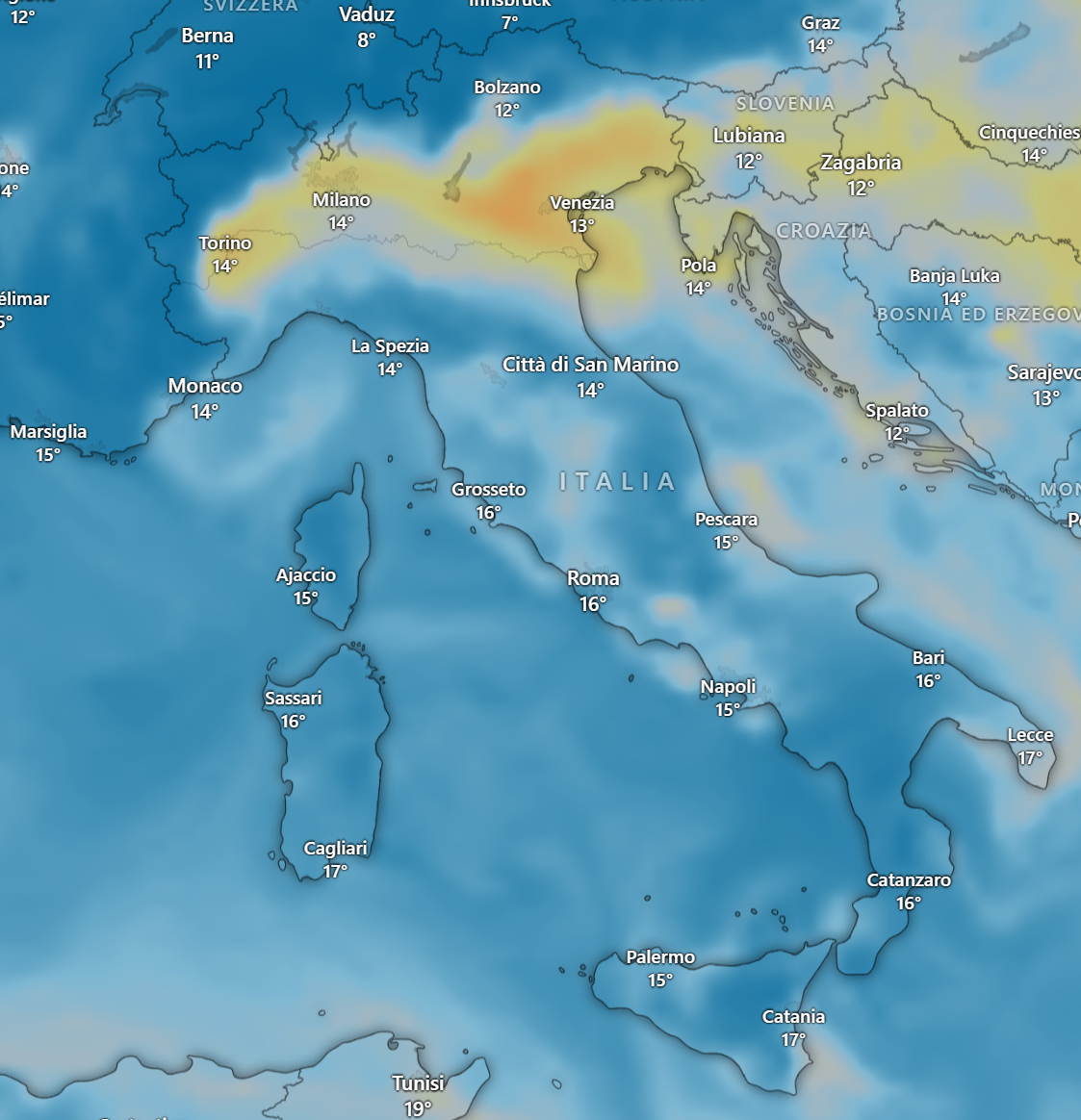 SITUAZIONE DEL PM 2,5 DI OGGI SABATO 16 MARZO SULL’ITALIA: