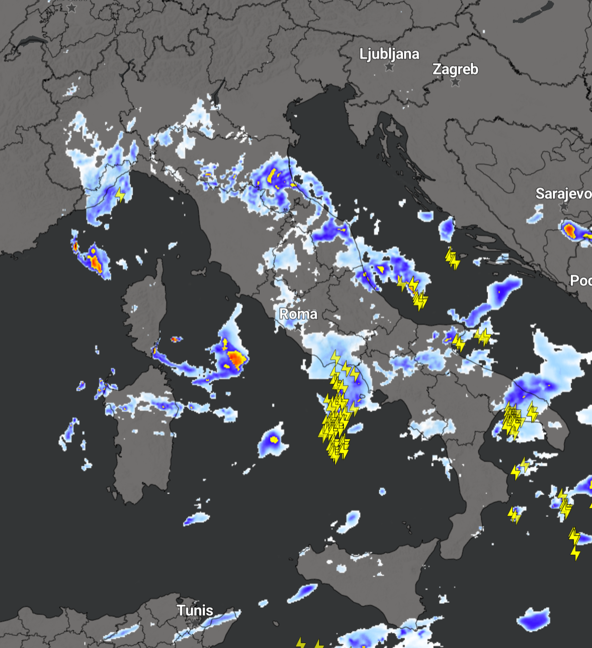 Mentre vi sono dei temporali anche di forte intensità sul Lazio, la Campania e la Puglia (clicca per ingrandire):