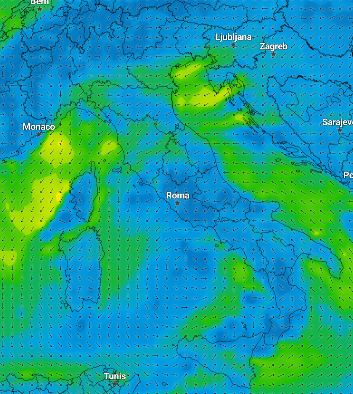 I venti sono a rotazione ciclonica e molto tesi sull’alto Adriatico soffia un forte vento di Grecale da Nord Est con raffiche fino a 70 km/h sul Friuli Venezia Giulia, Emilia Romagna, ma anche sulla Liguria e la Toscana.