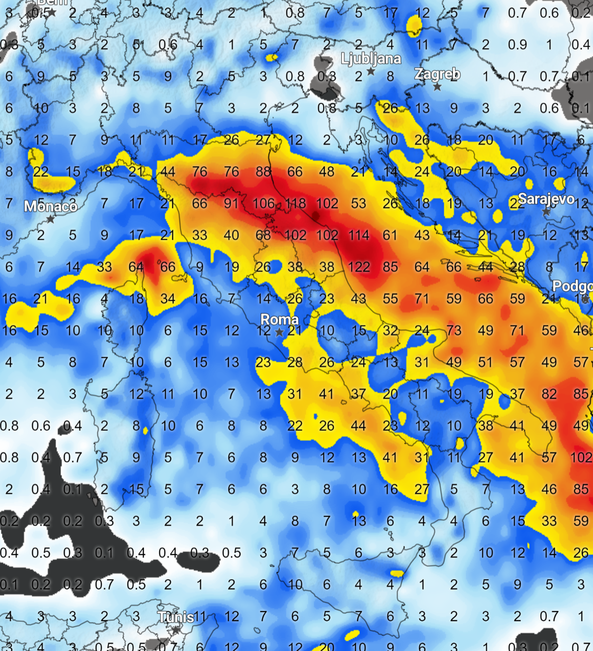 Entro 48 ore i fenomeni avranno raggiunto tutte le regioni d’Italia, ma bisognerà prestare attenzione sull’Emilia Romagna e sulle Marche, perché si potrebbero raggiungere precipitazioni fino a 110 mm che sarebbe l’equivalente di 110 litri di acqua per metro quadro, che sarebbero le precipitazioni di due mesi in sole 48 ore (clicca per ingrandire):