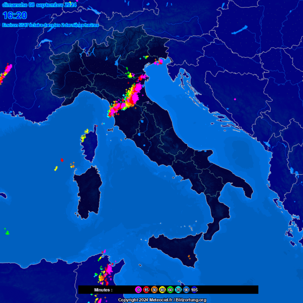 ORE 16: 30 MALTEMPO ITALIA LIVE: Intenso fronte temporalesco attualmente posizionato tra l’alta Toscana, l’Emilia Romagna orientale ed il basso Veneto, che sta apportando forti piogge e locali grandinate, oltre ad intense fulminazioni come ci mostra l’immagine radar dei fulmini (clicca per ingrandire):