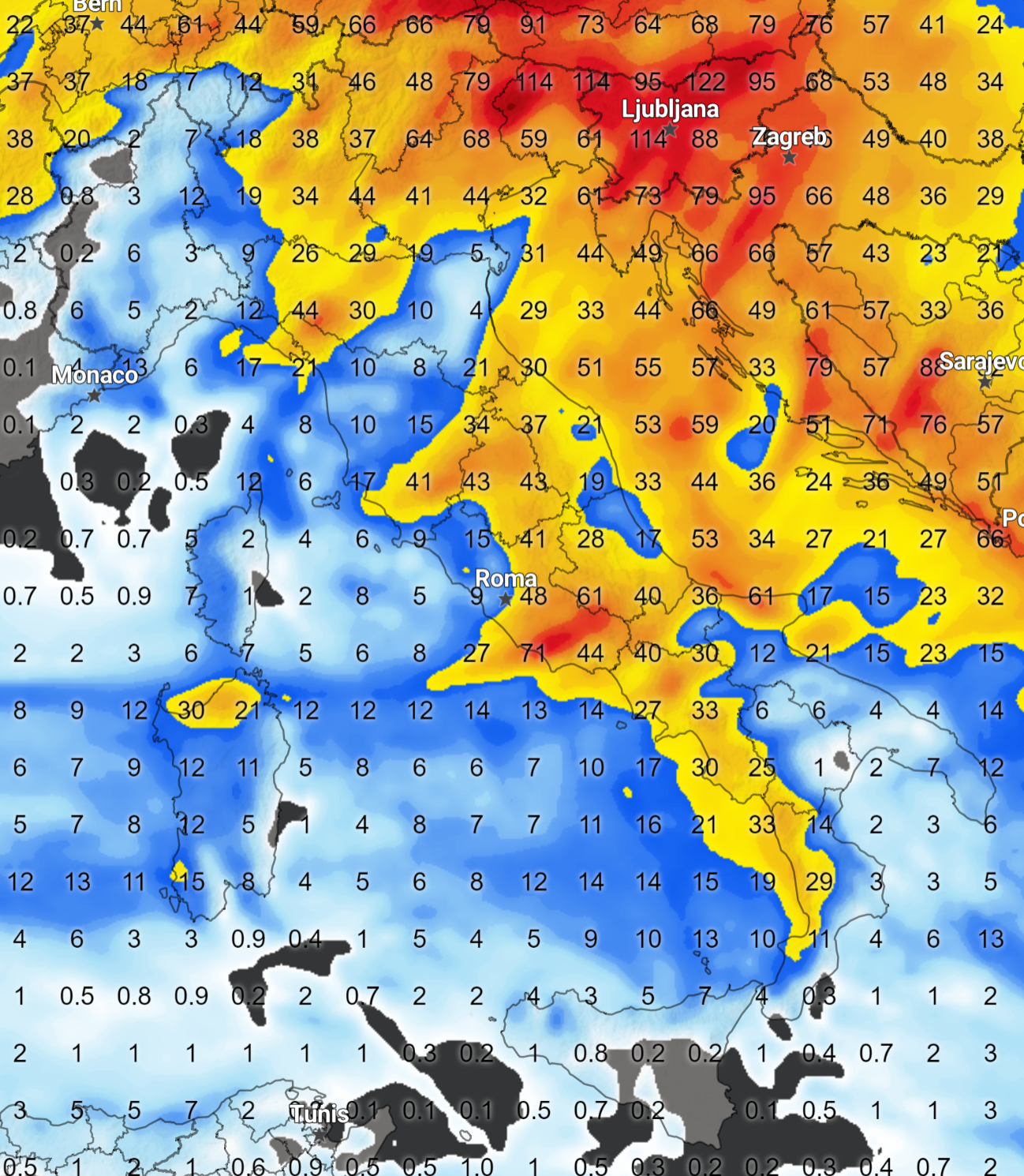 Queste sono le previsioni ma gli accumuli potrebbero essere anche superiori, a causa delle celle temporalesche che si svilupperanno dentro l’intensa perturbazione.