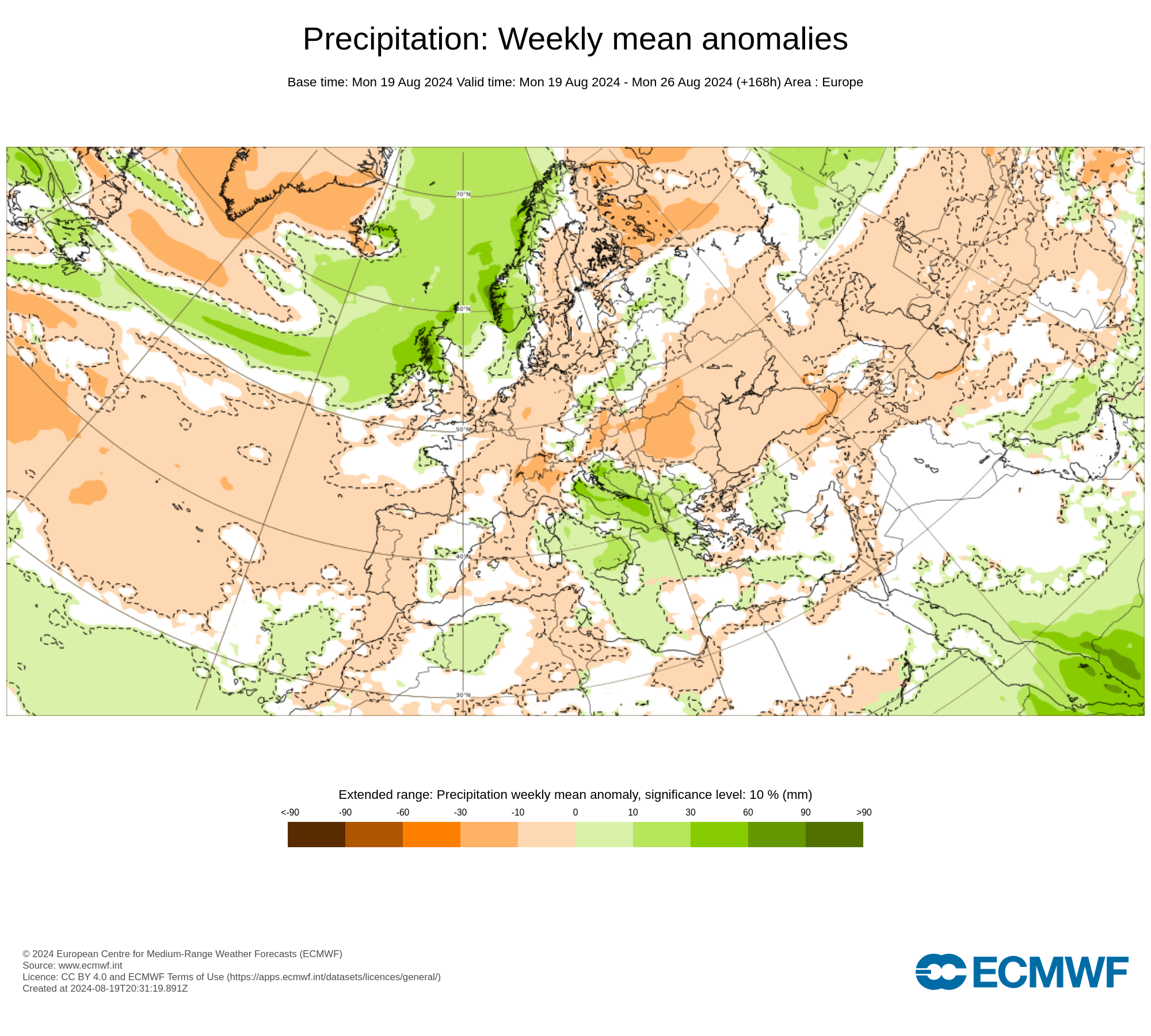 Di seguito vi mostrerò le possibili anomalie medie, delle precipitazioni e temperature elaborate dal prestigioso centro di calcolo Europeo ECMWF, per l’ultima decade di Agosto 2024.