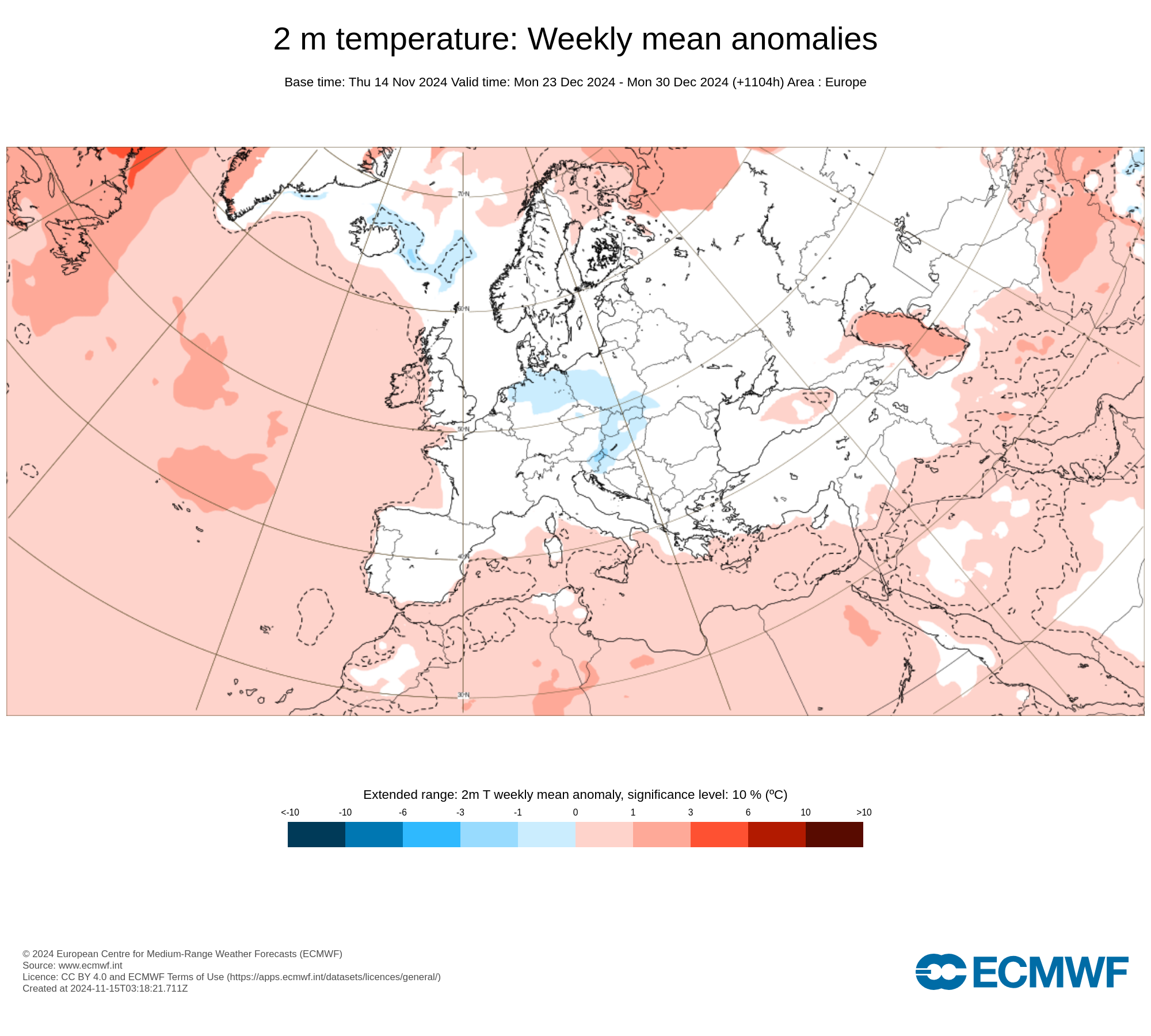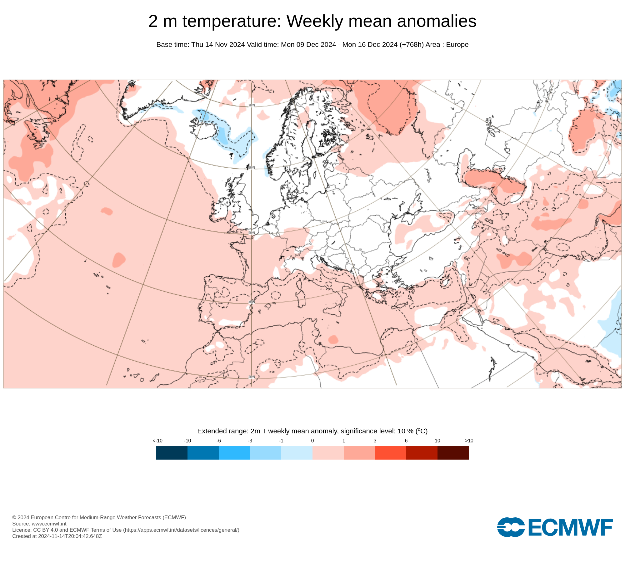Nella seconda decade di Dicembre 2024, le temperature al Nord dovrebbero rimanere in linea il periodo, mentre sul restante territorio potrebbero essere alcuni gradi al di sopra (clicca per ingrandire):