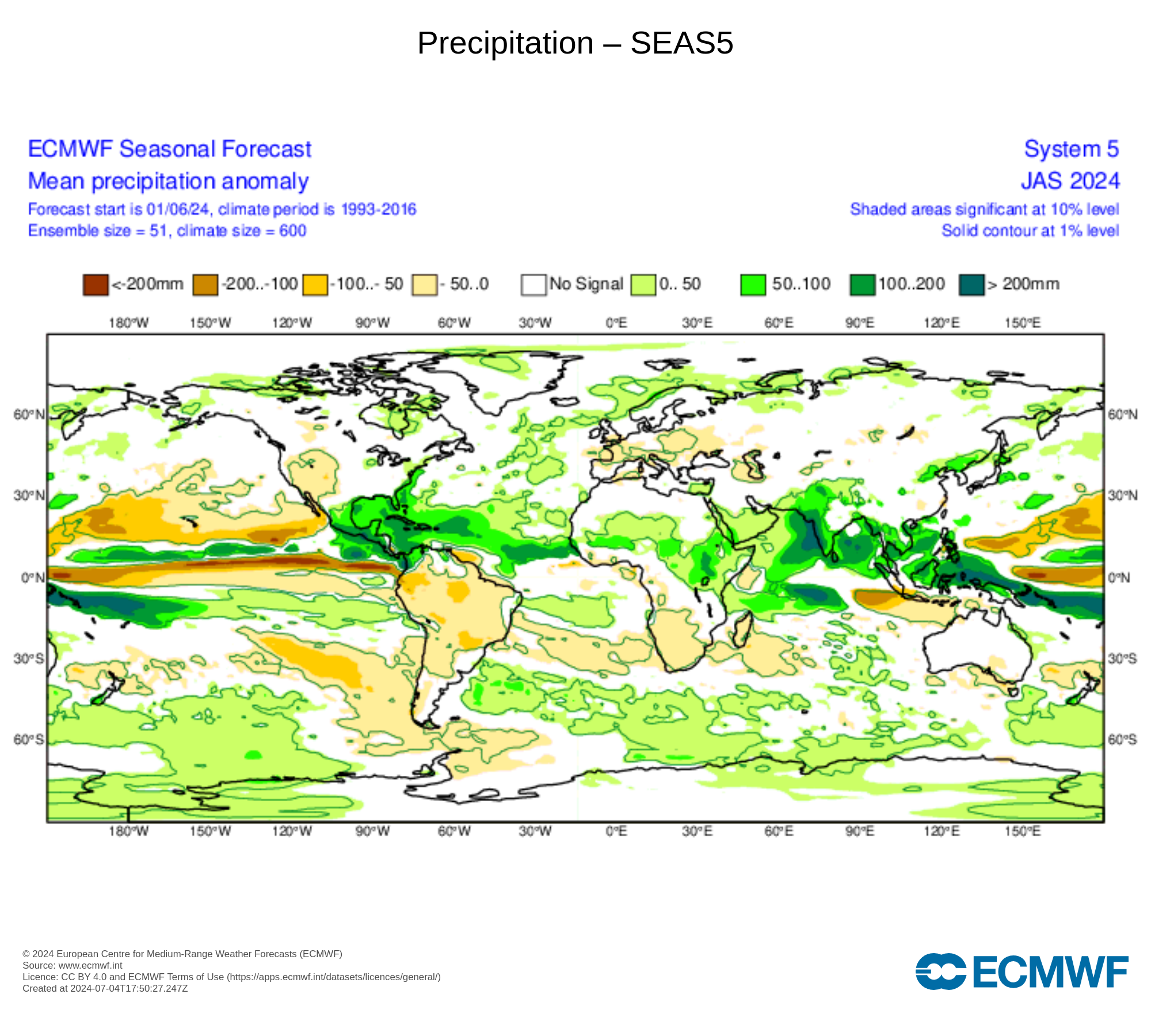Di seguito forniremo una linea di tendenza dell’Estate 2024 analizzando gli ultimi elaborati del prestigioso Centro Europeo ECMWF, che prevedono le anomalie delle precipitazioni e delle temperature, per i prossimi due mesi, rispetto al periodo di riferimento che comprende gli anni dal 1993 al 2016.