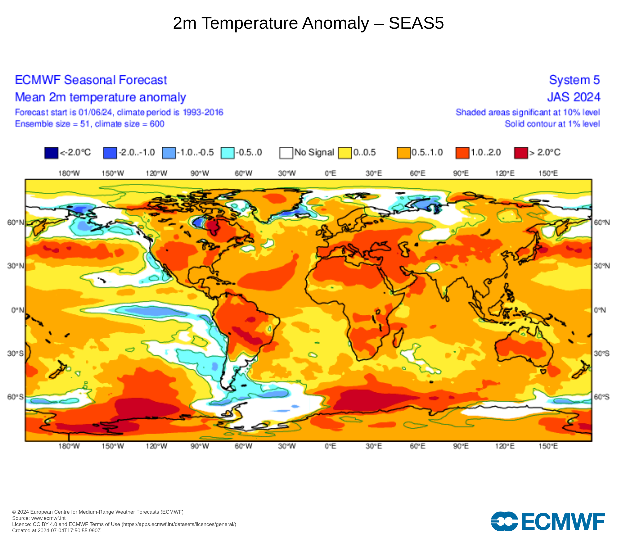 Nell’elaborato delle temperature previsto per Luglio 2024, notiamo come la media delle temperature mondiali, sia superiore alle media di almeno un grado (che nel reale si traduce in vari gradi sopra le medie) con punte fino a due gradi sulle Americhe, Il Nord e Sud Africa ed il sud dell’Europa, Italia compresa, oltre la Penisola Balcanica, gli Stati Arabi ed il Polo Sud.