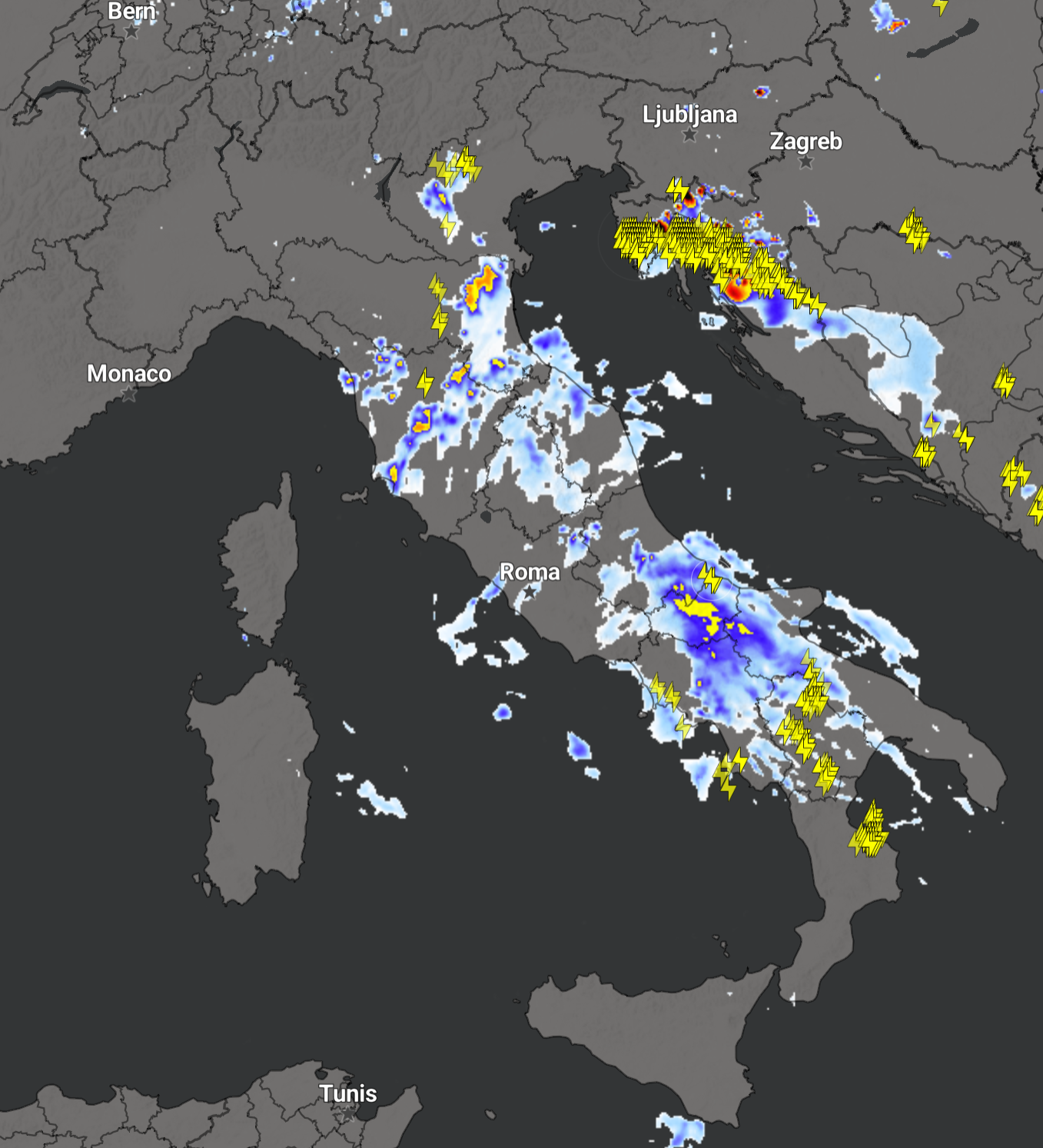 Nella mattinata odierna a causa di una goccia fredda in quota, si è attivato un primo fronte temporalesco organizzato al Centro Sud, che ha dispensato piogge e temporali sulle Marche, Lazio, Campania, Molise, Basilicata e Puglia.