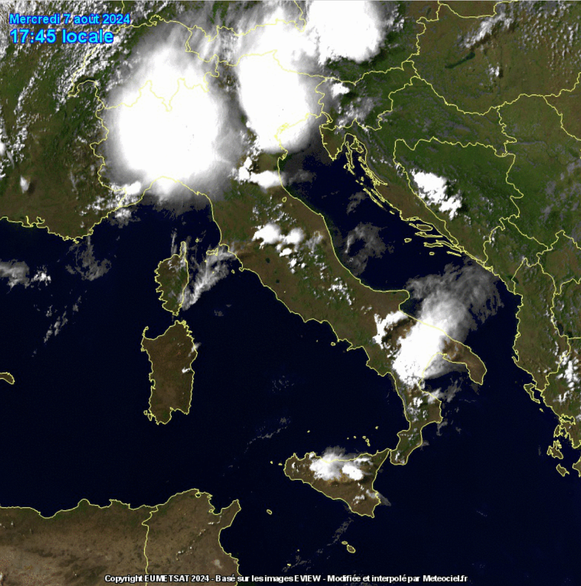 L’immagine satellitare delle 18 ci mostra la nuvolosità provocata dai temporali su tutta l’Italia e le due supercelle in azione al Nord (clicca per ingrandire):