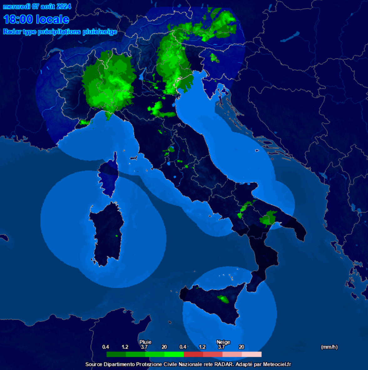 Il radar delle precipitazioni ci mostra la pioggia alle ore 18 (clicca per ingrandire):