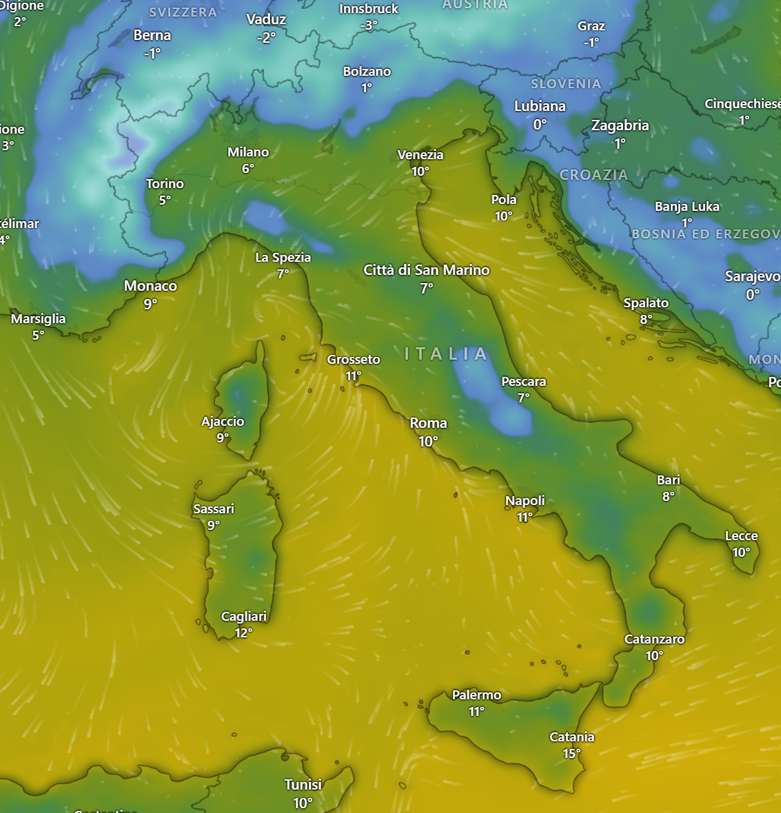 Attualmente i venti sono da Nord / Nord Est con la Bora in intensificazione e nelle prossime ore le temperature diminuiranno di molti gradi su tutto il Paese.