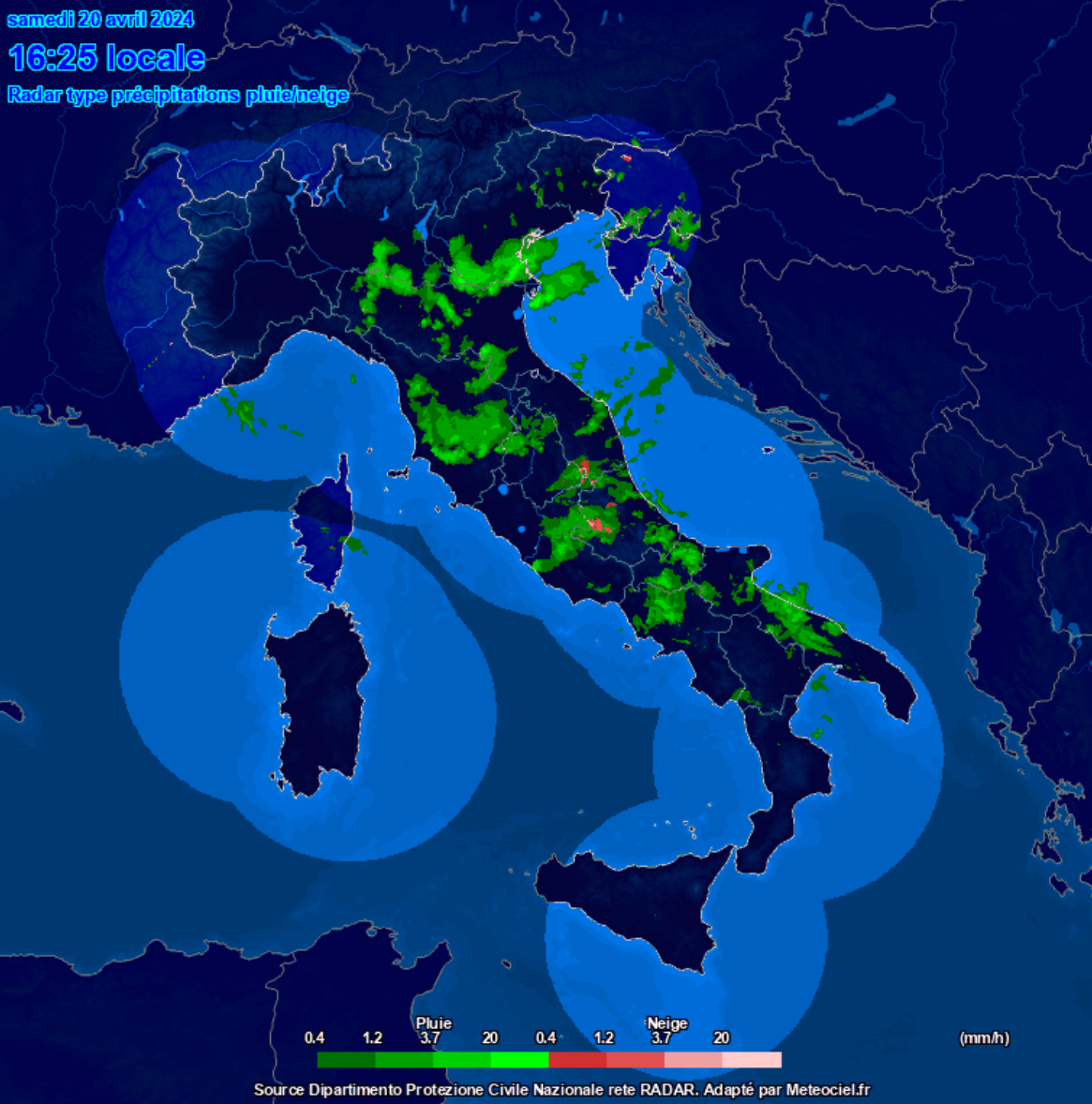 Nell’immagine del radar, le piogge sono presenti su quasi tutto il Paese, ad esclusione del Nord Ovest ed Isole maggiori.