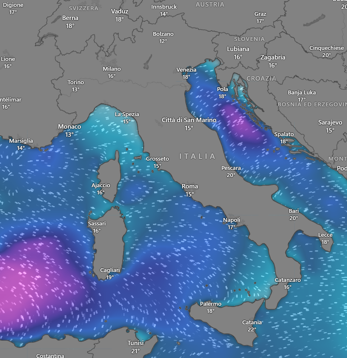Sulle regioni bagnate dal mar Adriatico, troviamo forti venti da Sud Est, con raffiche fino a 70 km/h.