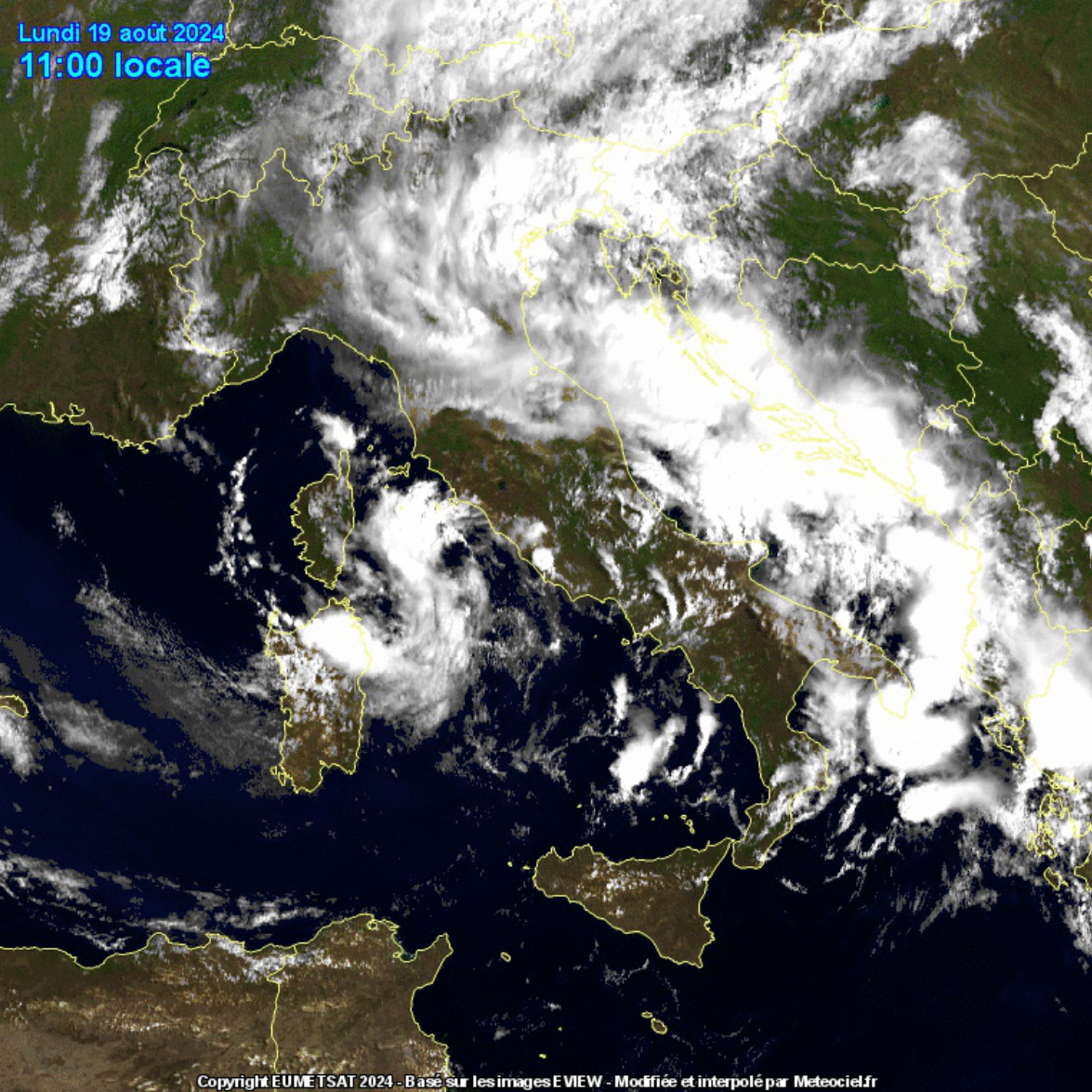 Dall’immagine satellitare delle 11 notiamo il cielo da molto nuvoloso a coperto su molti settori della Penisola (clicca per ingrandire):
