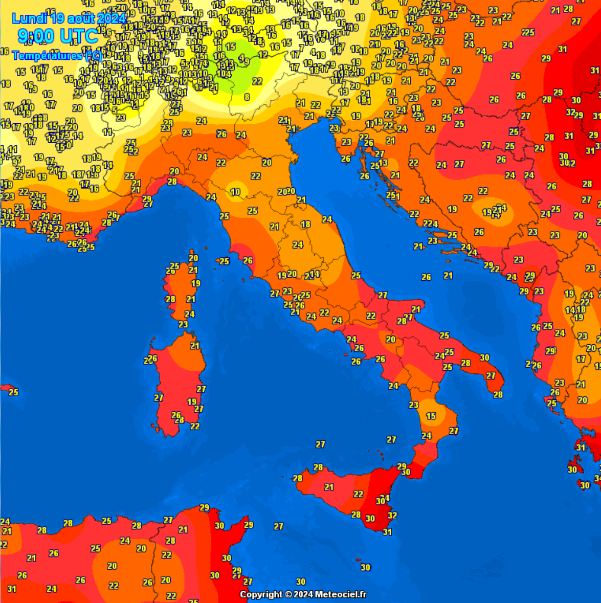 Le temperature al Centro Nord sono comprese tra i 18 ed i 22 gradi al Centro Nord con qualche punta di 25° al Nord Ovest, la Toscana ed il Lazio.