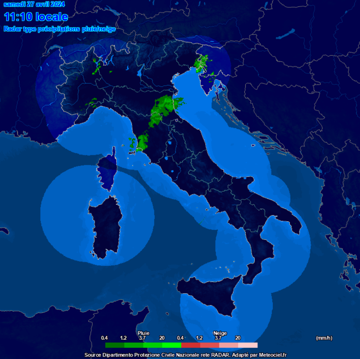 Sono segnalate piogge sulla Liguria, alto Piemonte, Emilia Romagna, basso Veneto e Friuli Venezia Giulia come ci mostra l’immagine del radar: