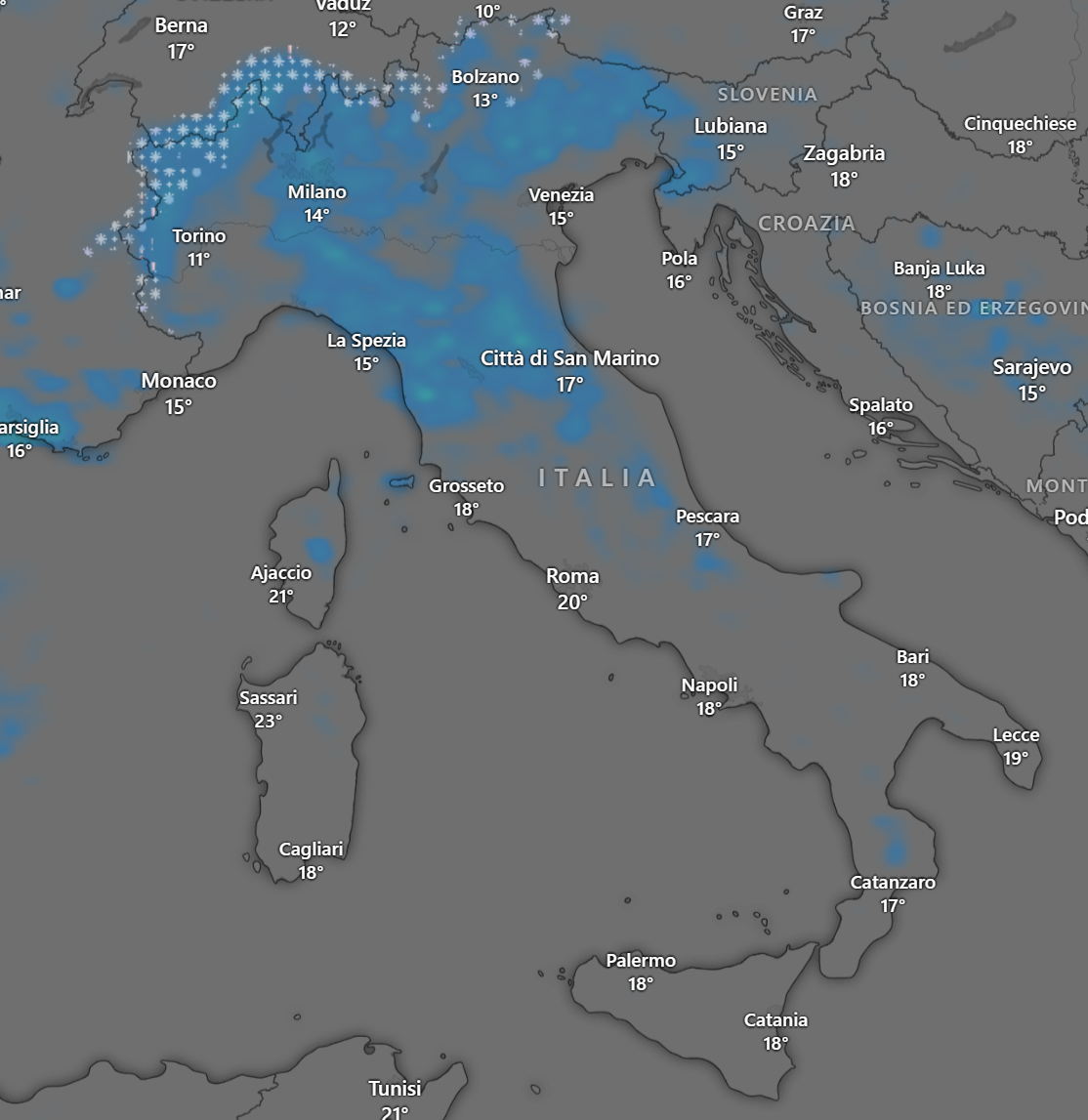 Sono previste delle piogge a carattere sparso sul Nord Italia, Toscana e Marche, oltre a nevicate sulle Alpi Centro occidentali a quote medie: