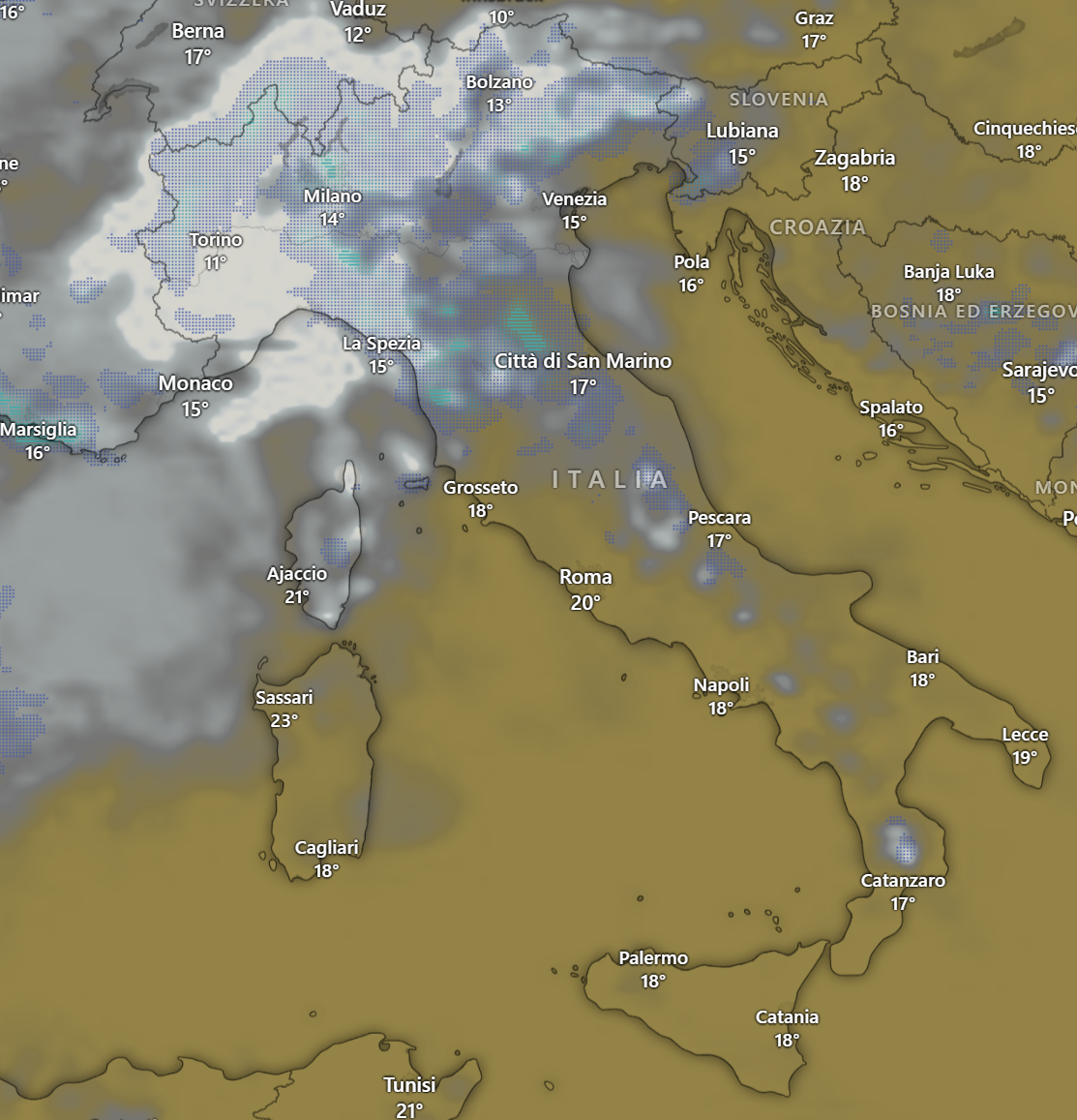 Attualmente sull’Italia è in transito una debole perturbazione, che sta apportando una nuvolosità compatta, al Nord e parte del Centro.