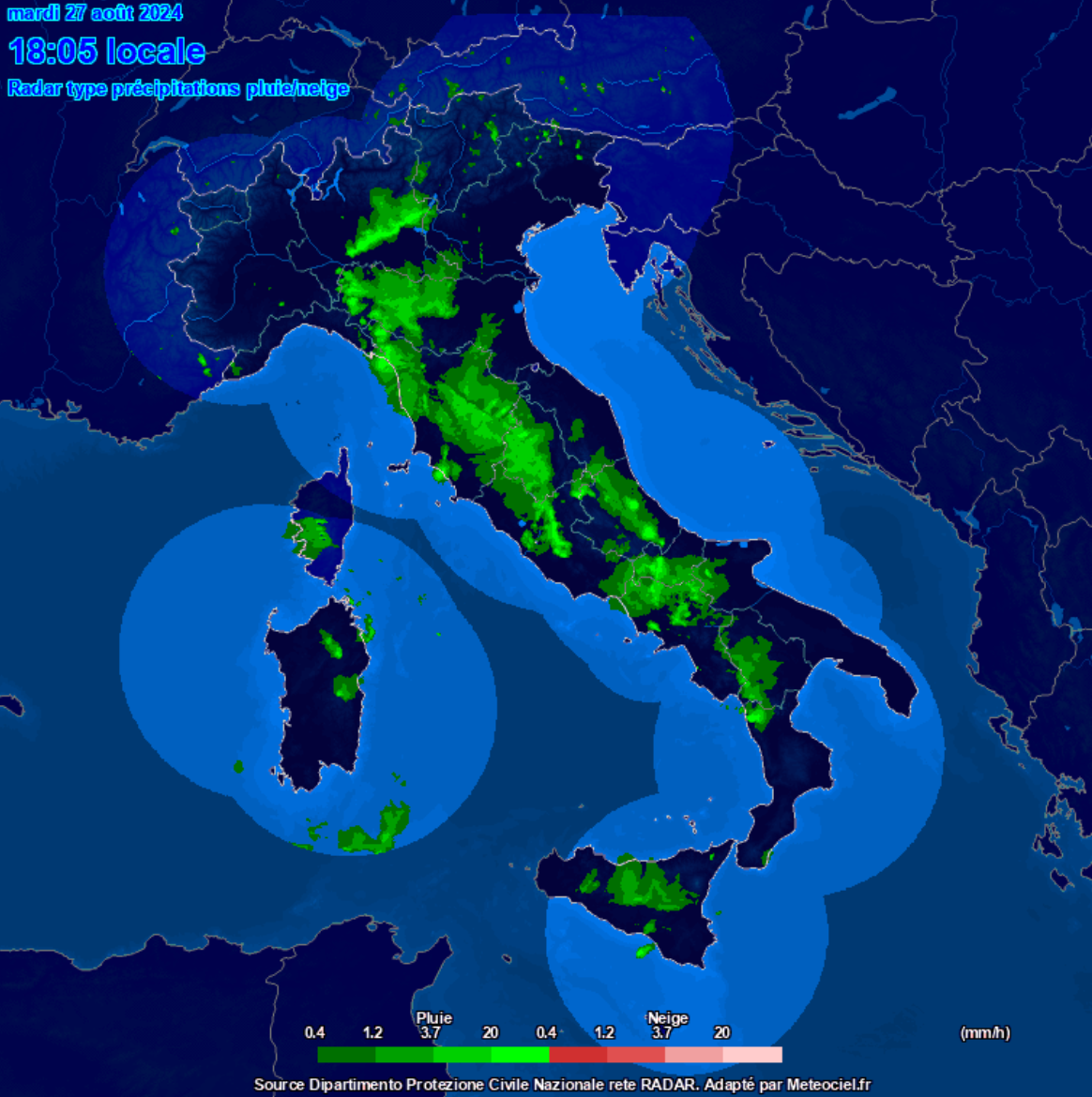 L’immagine del radar delle piogge ci mostra le precipitazioni in atto sull’Italia alle ore 18.